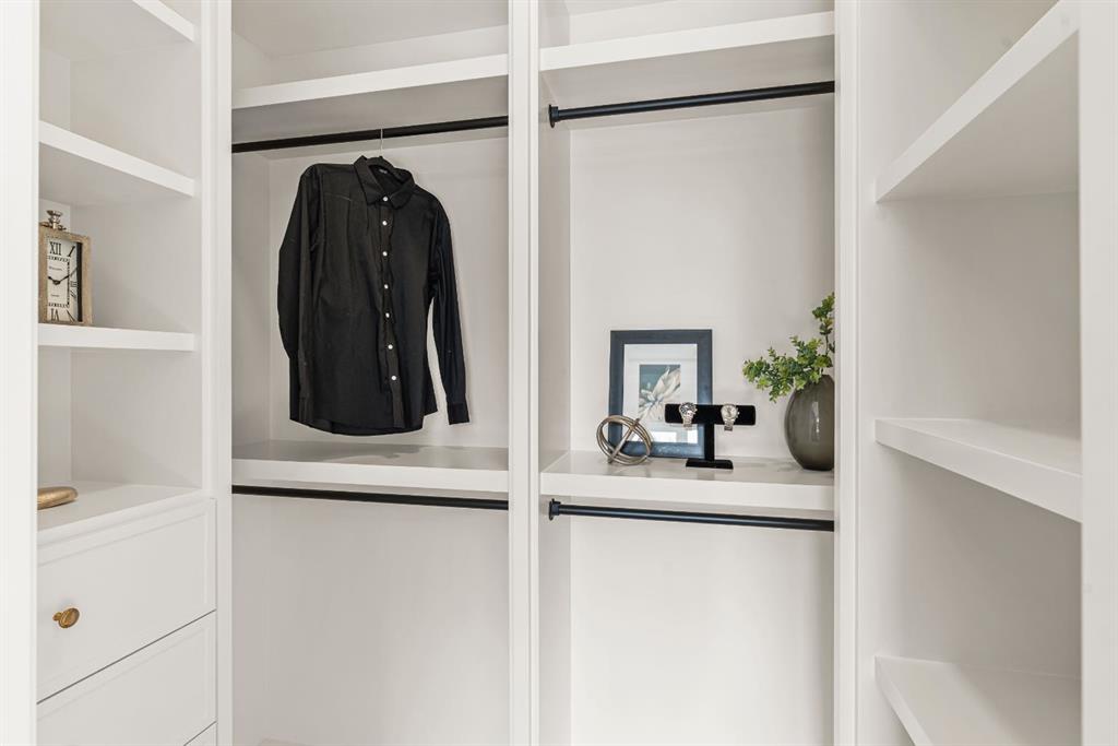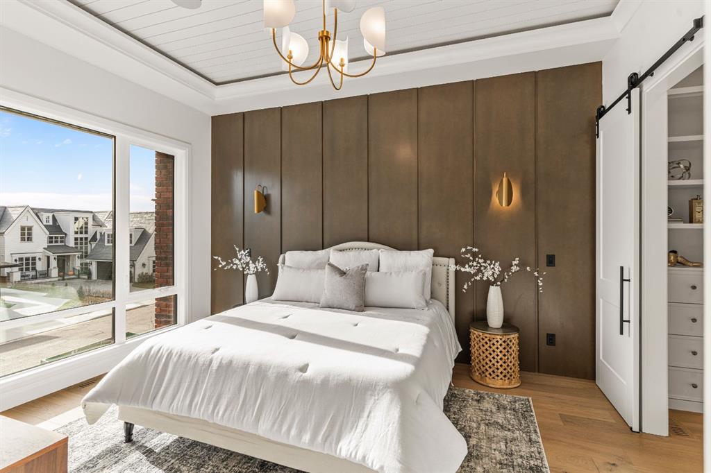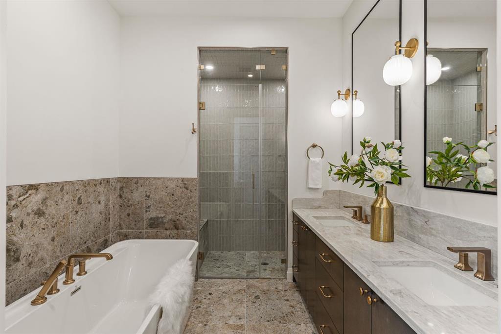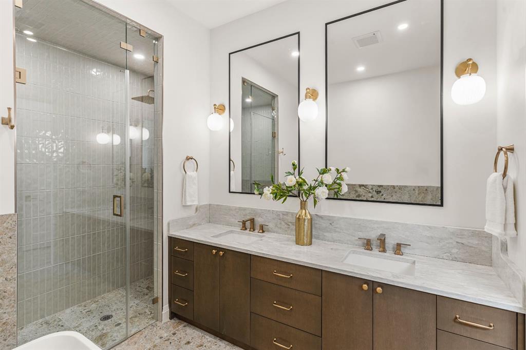 With vaulted 10-foot ceilings on the upper floor, the primary suite feels like a private retreat, featuring heated floors, a curbless steam shower, freestanding tub, and dual walk-in closets. Two additional bedrooms — each with walk-in closets — share a spacious five-piece bath, while a pocket office provides a quiet spot to work or study.