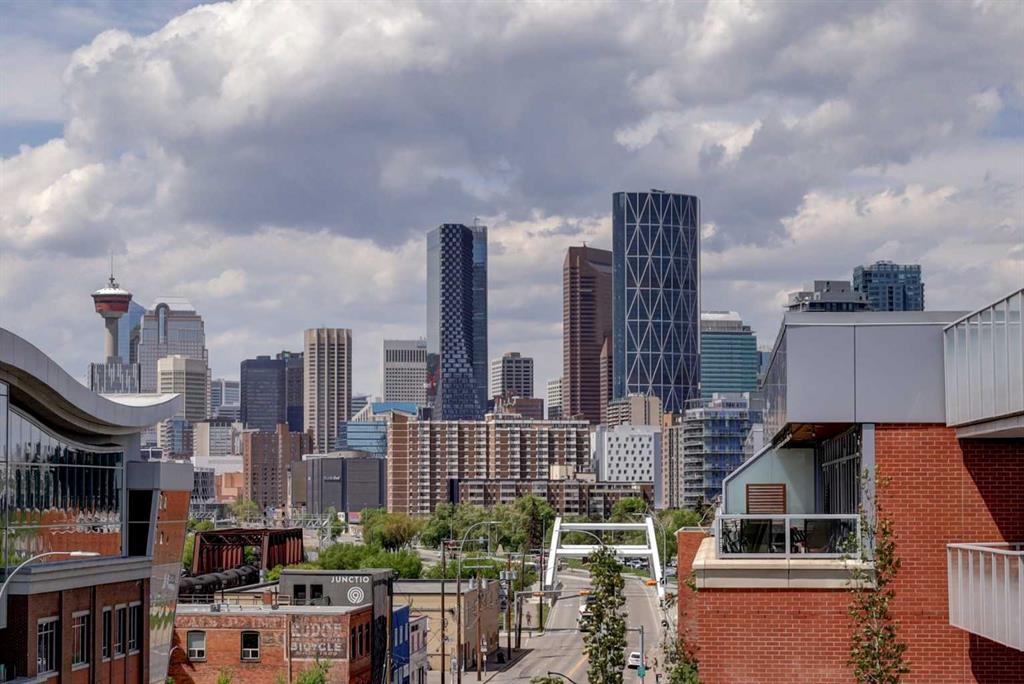 Welcome to unit 601, a stylish 1250+ sq ft sub-penthouse in the modern Avli On Atlantic- a very sleek building in historic Inglewood, steps to great shopping, excellent restaurants, cool pubs and an easy walk to the Bow Valley pathways, Fort Calgary,The Saddledome and downtown. This large 2 bedroom, 2 bathroom, 2 titled parking stall unit features a wall of windows flooding the main living space with natural light, architectural touches - cove ceilings, concrete pillar, gleaming tile floors and custom roller blinds. The European style kitchen has ample counter space, built in pantry, integrated dishwasher & fridge, additional cabinets and an extended quartz island with wooden accent, all over looking the dining and main living area, perfect for entertaining. Dual sliders open to the large 300+ square foot wrap around patio (with n-gas hook up) where you have stunning views of 9th Avenue, Ramsey, Inglewood and downtown. The large primary bedroom has modular storage cabinets and a 4 piece ensuite with floating dual vanity & heated floors, an excellent retreat. This unit has it all including ensuite laundry and storage, additional large storage locker, secure bike storage, visitor parking, guest suite and common furnished terrace (3rd floor) for larger get-togethers. The building is very well taken care of and the location is supreme.