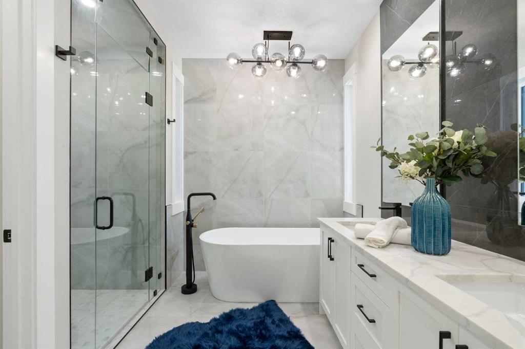 Upstairs, the primary retreat impresses with vaulted ceilings, a large walk-in closet, and a spa-inspired ensuite with dual sinks, a freestanding tub, and a glass-enclosed shower. Two additional bedrooms, a stylish main bath, and convenient upper laundry complete this level.