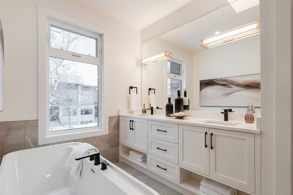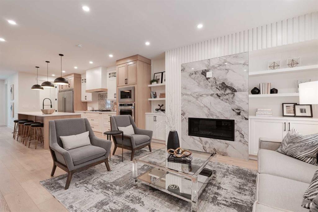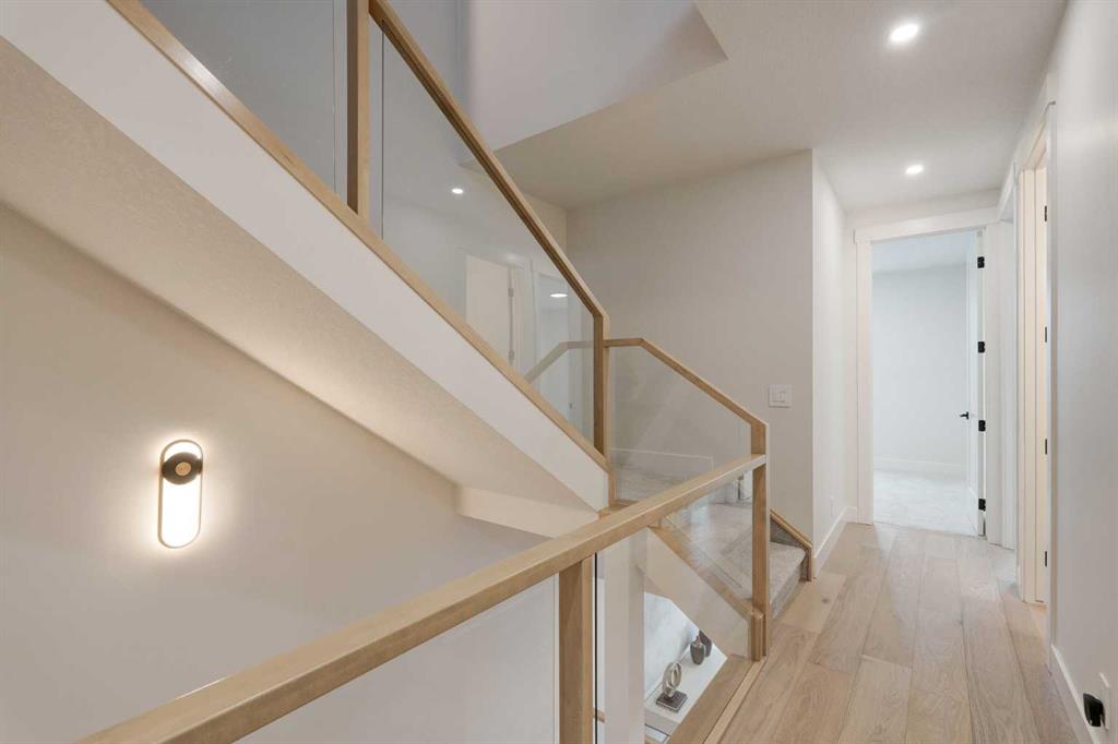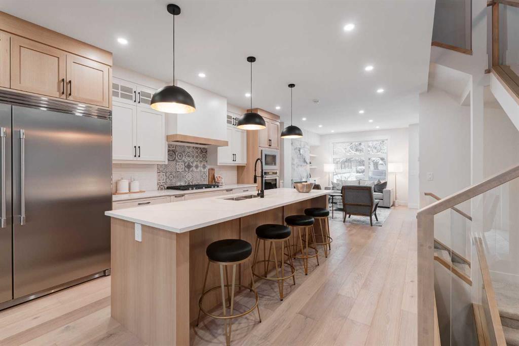 Priced to Sell! Discover modern luxury in this 5+ bedroom, 4 1/2-baths, semi-detached home boasting 2,468 sq. ft. across three levels, plus a fully developed 868 sq. ft. lower level. The main floor features an elegant central Kitchen with long island, elegant two-tone cabinetry, gorgeous countertops, custom covered hoodfan, black accents, and upscale stainless steel appliances including a commercial grade fridge! This Kitchen layout is ideal for entertaining; complete with a convenient walk-in pantry with a countertop, shelves and drawers that makes organizing a breeze! White oak engineered hardwood flooring flows throughout, complementing high ceilings on the Main and Lower levels. The 2nd level features a spacious Primary bedroom with an impressive walk-in closet, luxurious 5 piece ensuite with deep pedestal soaker tub, over-sized shower, separate water closet and dual vanity with culture marble countertop. It also has its own private West-facing deck! There are also two more bedrooms, a 3-piece bathroom and an oversized laundry area with an impressive amount of countertop space, laundry sink and cabinetry. The 3rd floor bonus area has a very spacious living area, a large bedroom with an impressive walk-in closet, 3-piece bathroom and an additional walk-in closet. This floor also has an AMAZING outdoor living space that could easily fit a sectional, fire-table and dining set to enjoy those warm starry Calgary evenings! The lower let has another bedroom, a den, study nook, 3-piece bathroom, and a games/recreation/media area with a wet bar. Outdoor living with three decks adds so many living options. The property also has a private backyard with double detached garage and new fencing on both sides of the property. With impeccable design, ample space, and a prime, tree-lined, inner city southwest location in Killarney - just steps away from schools, parks, pathways and other conveniences, this home and location is a true gem!