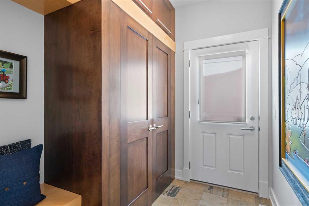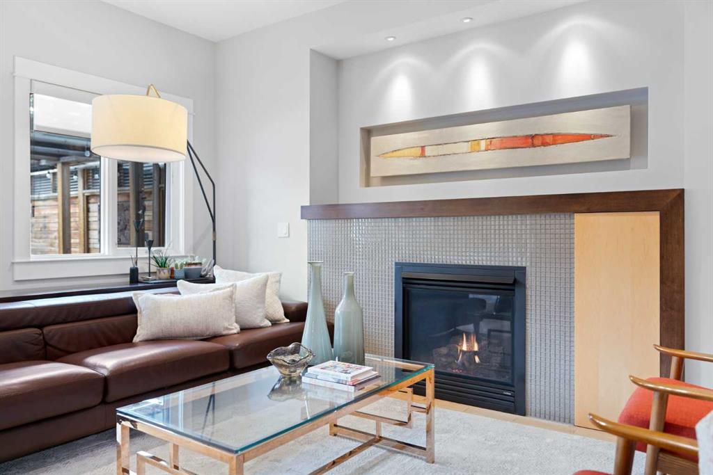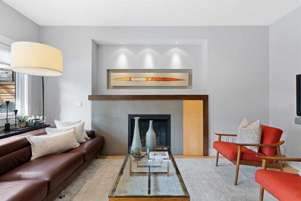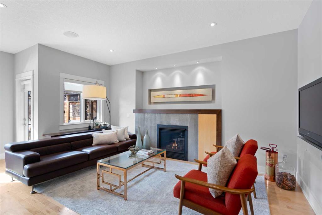 The open-concept living room is both warm and elevated, centred around a gas fireplace with custom built-ins and curated art lighting and opens onto a flat, ground-level WEST backyard—perfect for seamless indoor-outdoor living. A functional mudroom with custom cabinetry completes the main level.