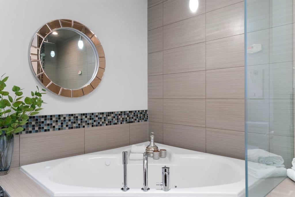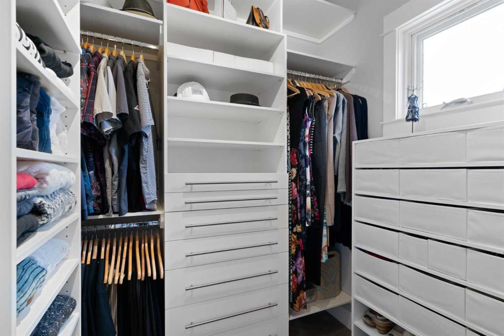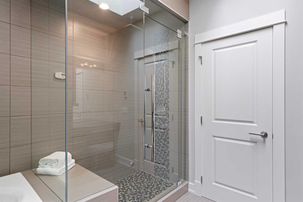 Upstairs, the primary suite feels like a true retreat. The VAULTED bedroom is spacious and calming, while the ENSUITE brings in natural light through a SKYLIGHT and offers a spa-like setup w/ a STEAM SHOWER, jacuzzi tub, in-floor heat, and a make-up station, plumbed for a second sink. A fully built-out walk-in closet includes custom shelving and dedicated jewellery drawers. Two additional bedrooms are bright and well-sized (one w/ a walk-in closet), paired w/ a modern main bath and convenient upper laundry w/ built-in sorting stations.