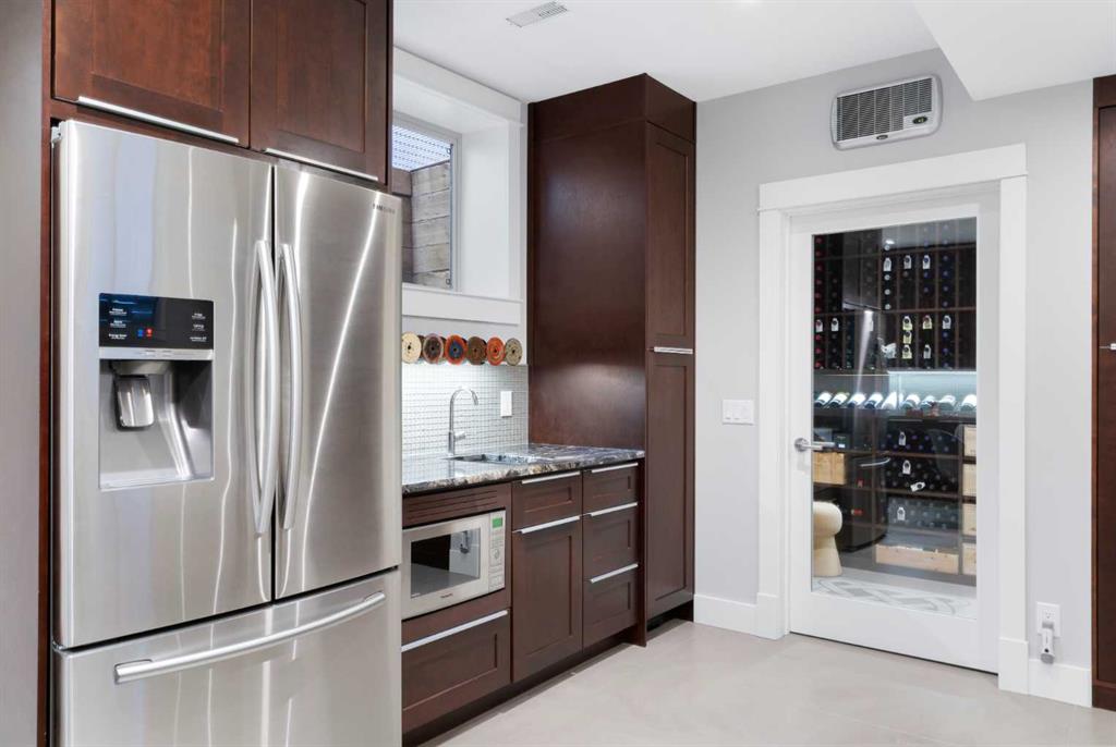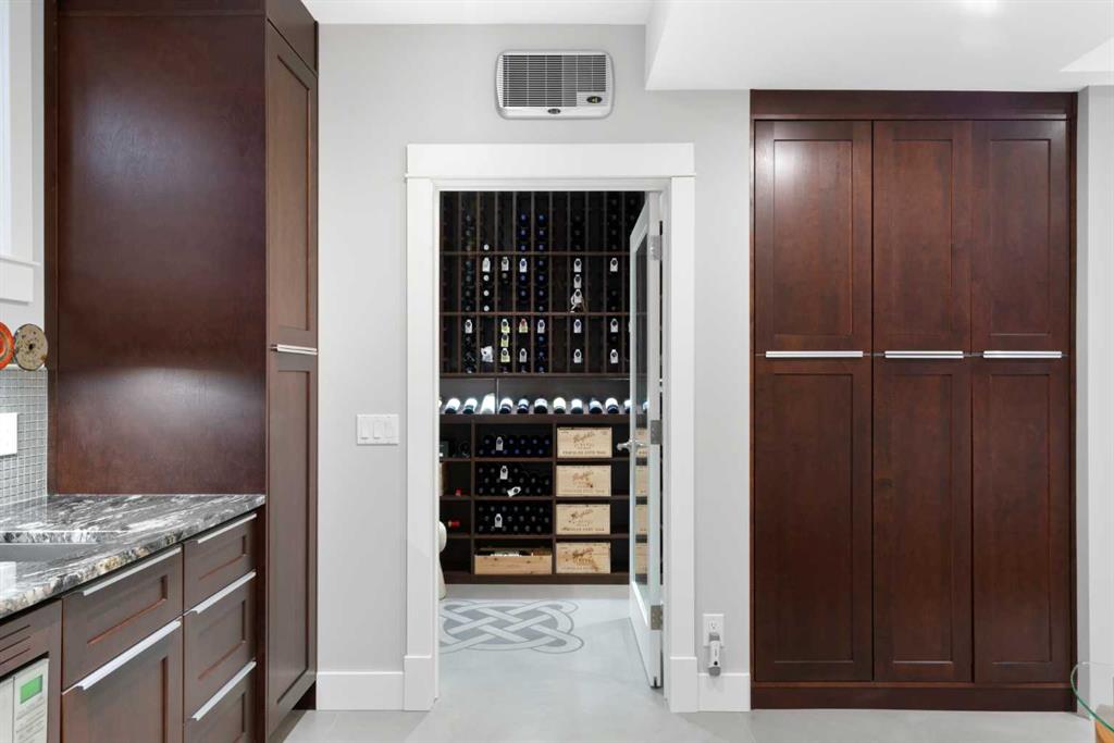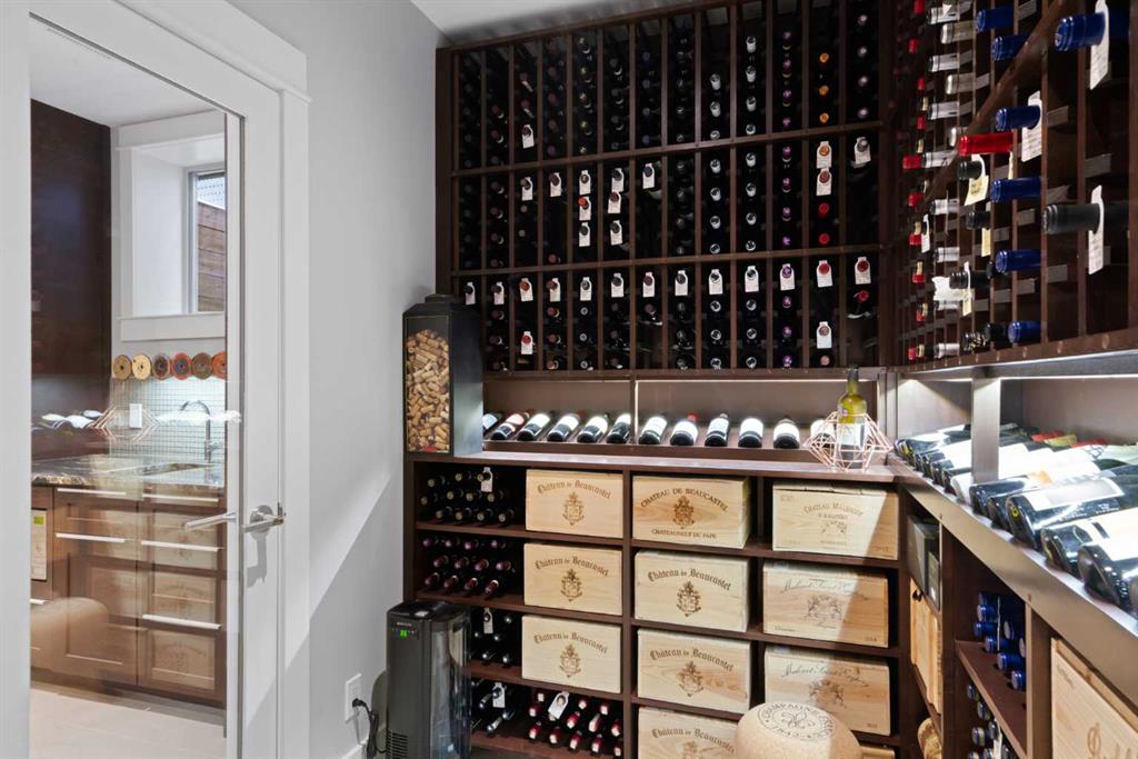 The basement is fully developed and finished to the same elevated standard. Custom concrete HEATED FLOORS run throughout, paired w/ a second gas fireplace, custom cabinetry, and a full bar complete w/ sink, full-sized fridge, and convection microwave. A CLIMATE-CONTROLLED WINE ROOM adds a striking focal point, and can be kept as a showpiece or reimagined as a home gym, private office, or hobby space. There’s also a large bedroom, full bathroom, and storage, including a pantry under the stairs.