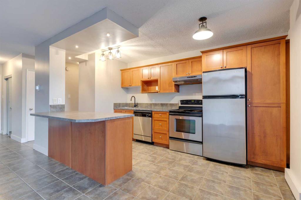Open concept concrete building with 2 BEDROOMS + 1 bath and IN-SUITE LAUNDRY has been remodeled with designer colors and offers an abundance of light throughout. The open layout includes a renovated kitchen with maple shaker cabinets, stainless steel appliances & a spacious island open to the living & dining room with access to your private oversized balcony with downtown views. Two large bedrooms each with large windows & a shared 4-piece bathroom. Fantastic inner-city location within walking distance to the Downtown core, public transportation, and everything that trendy 17th Avenue has to offer. Don't forget the covered assigned parking stall.