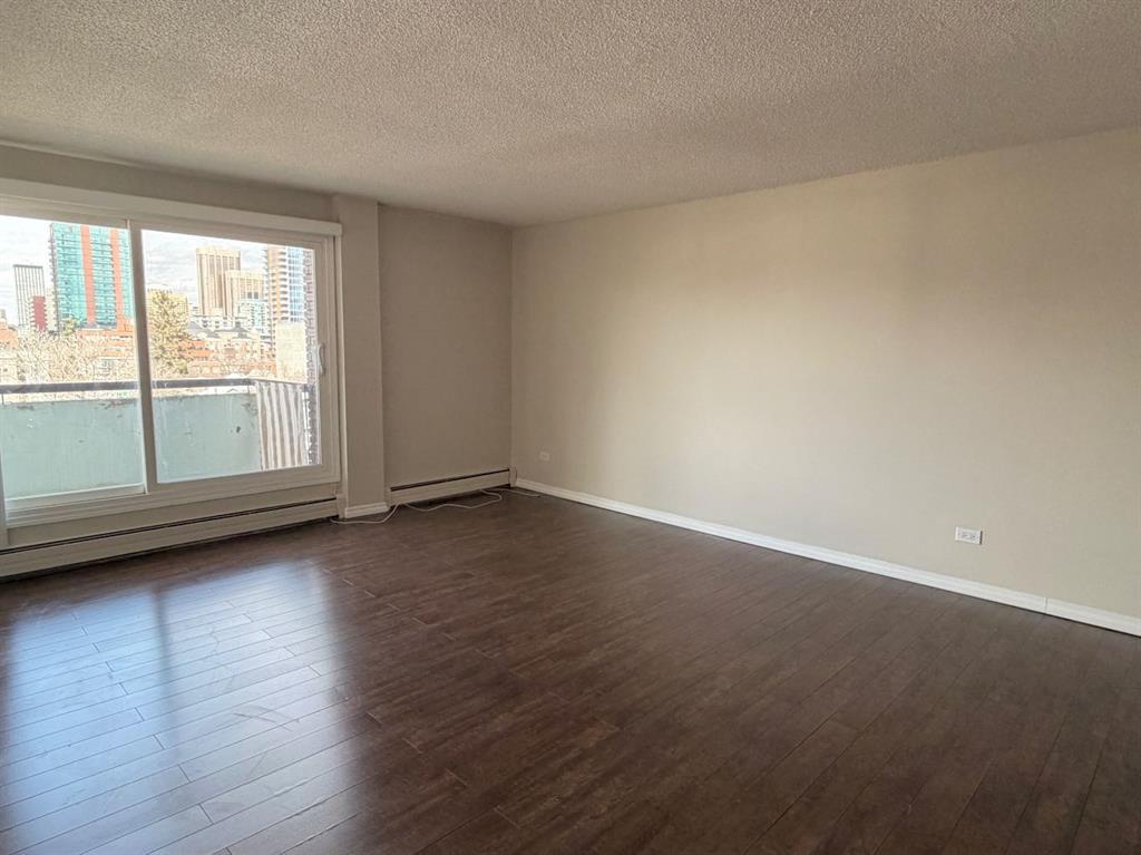 This freshly painted top-floor 1 bedroom, 1 bathroom unit offers a functional layout with a kitchen featuring a raised breakfast bar and adjacent dining area. The spacious living room with laminate flooring opens onto a north-facing covered balcony with beautiful downtown views.