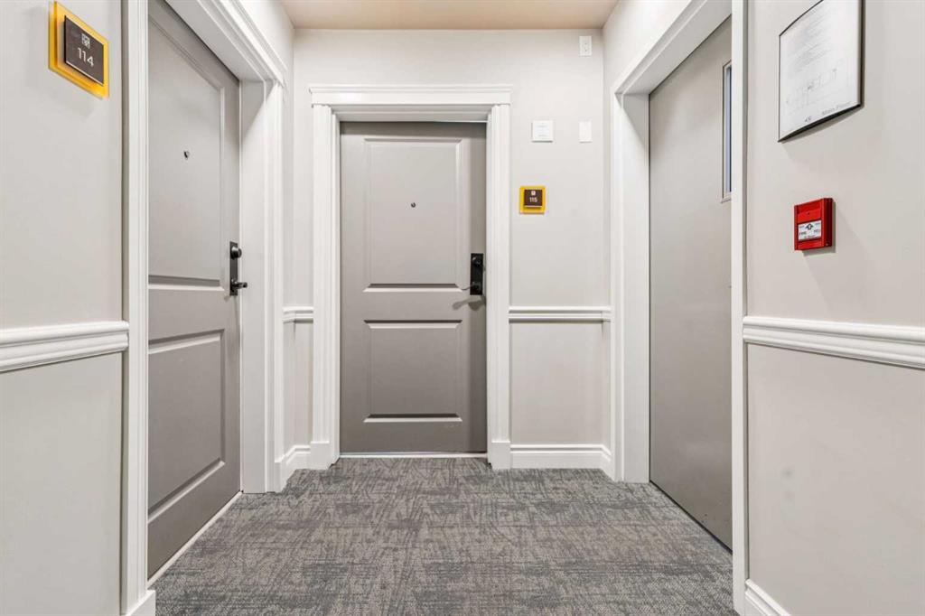 Step into this showcase worthy main floor corner unit offering almost 900 sq ft of bright, open concept living. Soaring 11 foot ceilings and floor-to-ceiling windows flood the space with natural light, creating an airy, upscale feel the moment you walk in. The modern white chef inspired kitchen features sleek quartz countertops, stainless steel appliances, and plenty of cabinetry perfect for cooking, hosting, or enjoying a quiet night in. The layout is ideal with two spacious bedrooms positioned on opposite sides of the unit for added privacy, along with two full bathrooms, including a stylish ensuite. Enjoy the convenience of in-suite laundry, durable mahogany-tone vinyl flooring, and the comfort of being on the main floor, no elevators needed. As a corner unit, you benefit from extra windows, enhanced privacy, and additional outdoor exposure. Located just steps from shopping, restaurants, transit, and daily amenities, this home blends modern style with unbeatable convenience. Perfect for first time buyers, downsizers, or investors.