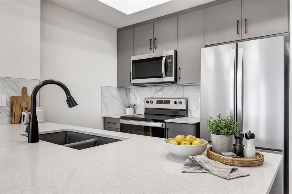 Perched on the top floor, this beautifully designed 1-bedroom, 1-bath condo offers soaring ceilings and an airy, open feel that instantly feels like home. Sunlight pours into the living space, highlighting the modern finishes—quartz countertops, sleek luxury vinyl plank flooring, and brand-new Whirlpool stainless steel appliances—all thoughtfully chosen to blend style with effortless living.