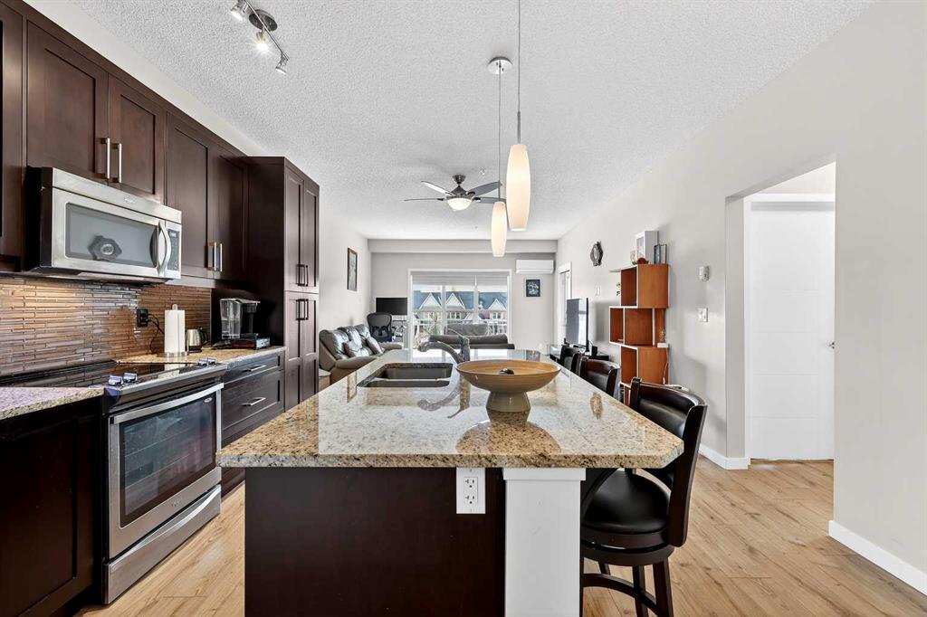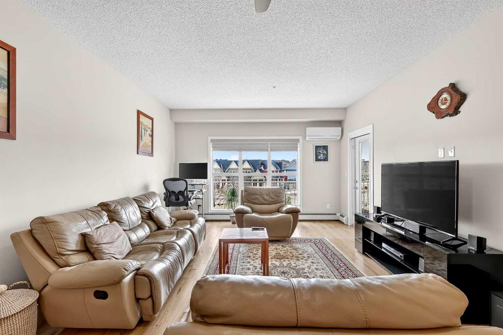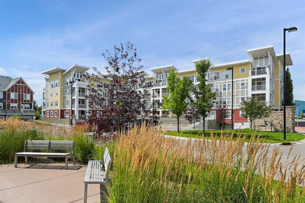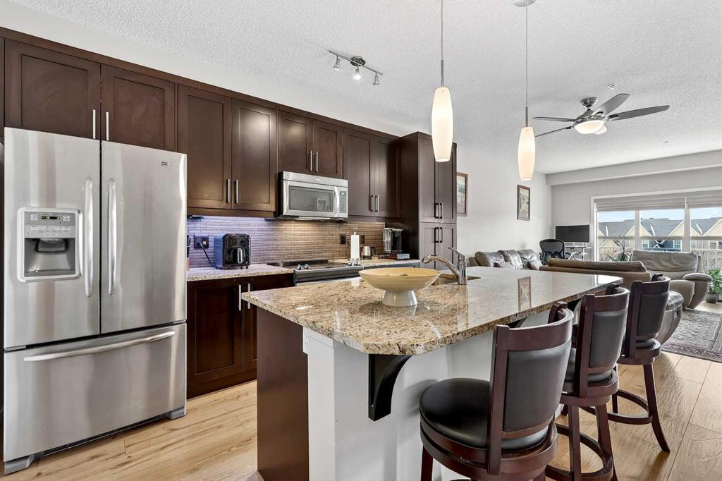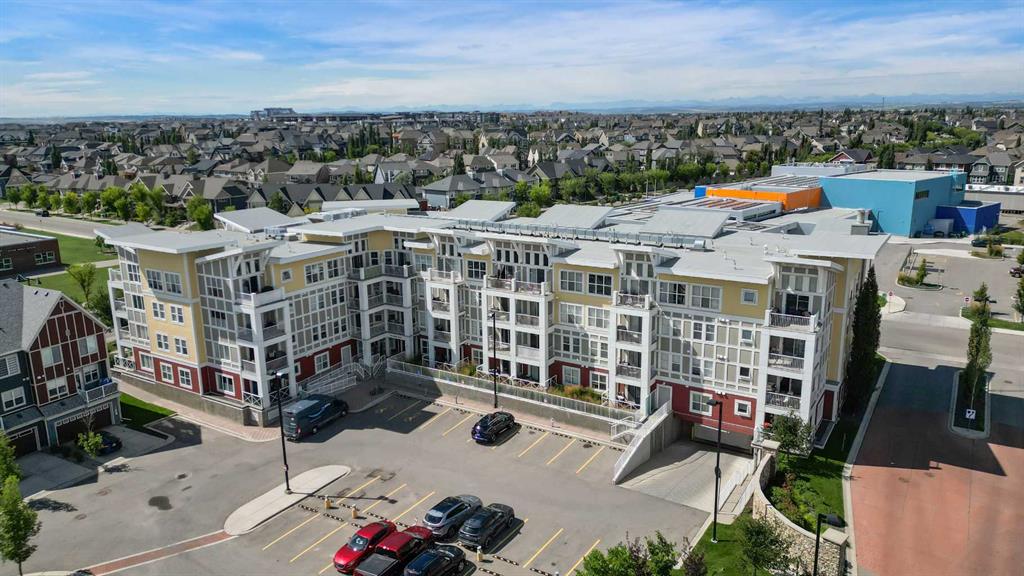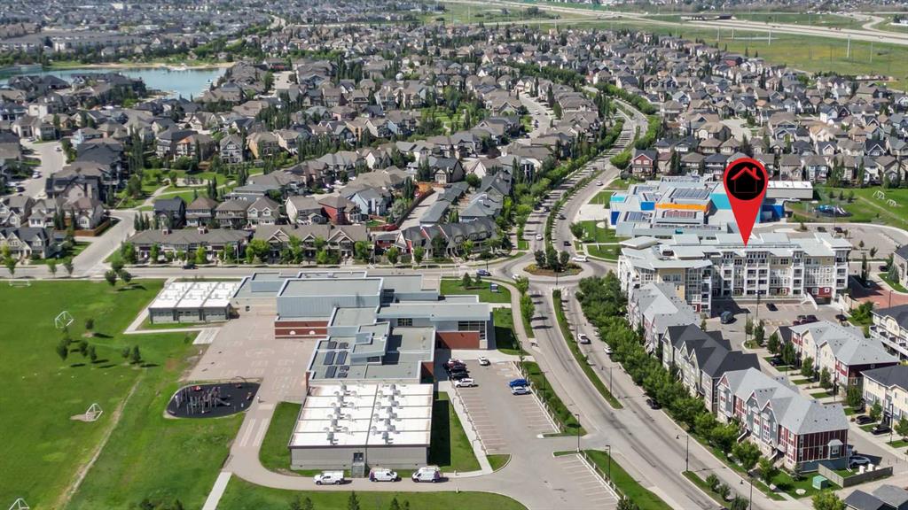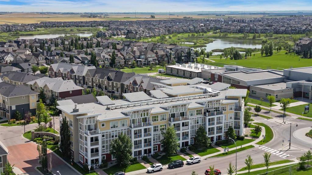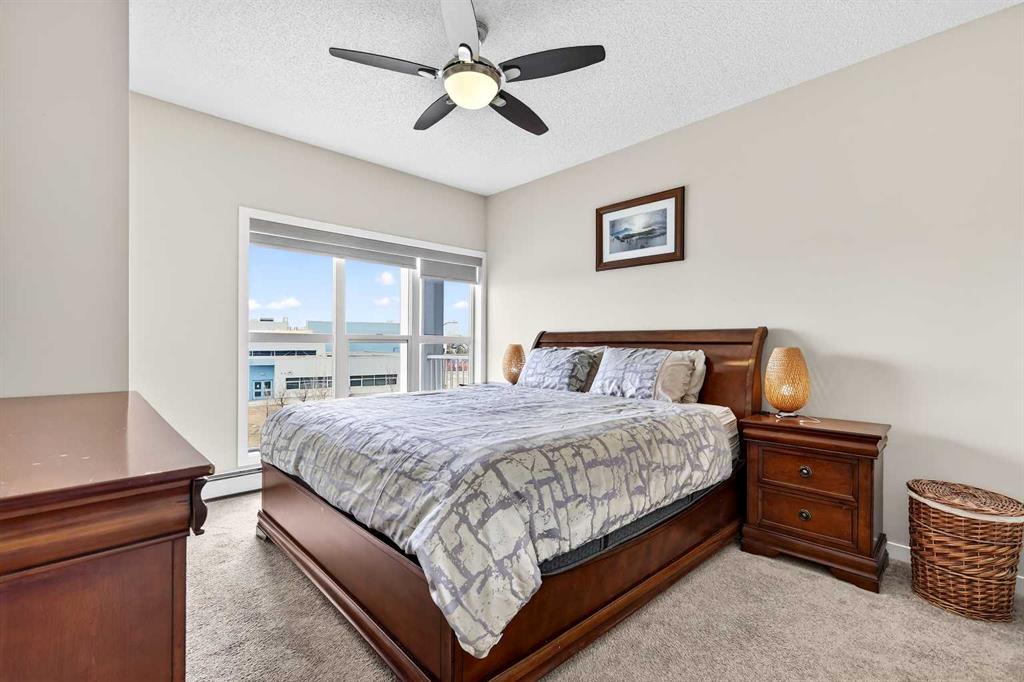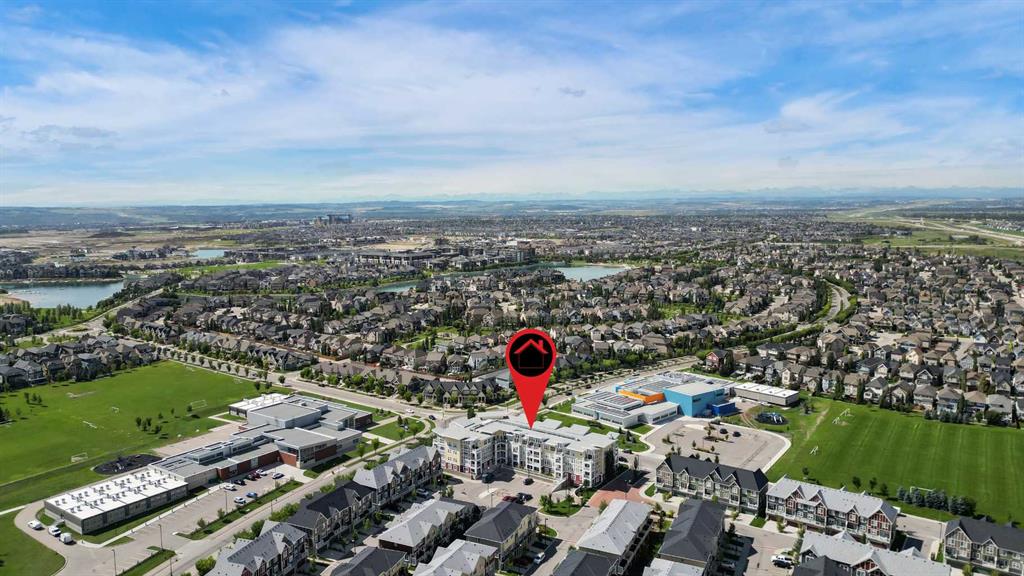 Welcome to Ebony in Mahogany—where elevated condo living meets the beauty and lifestyle of Calgary’s premier lake community. Perfectly positioned on the third floor with a coveted southwest exposure, this stunning and spacious apartment offers one of the largest floorplans in the complex, paired with an abundance of natural light and thoughtful design that sets it apart from the rest. From the moment you step inside, you are greeted by soaring ceilings just under 9 feet and oversized windows in both the living room and primary suite—creating a bright, open atmosphere that feels expansive and inviting. Bathed in warm evening sunlight, this home offers a truly special ambiance to be enjoyed throughout all four seasons. The kitchen is both stylish and functional, featuring rich dark cabinetry, elegant granite countertops, and a full stainless steel appliance package. A generous walk-in pantry provides exceptional storage and organization, while in-suite laundry adds everyday convenience. The kitchen flows seamlessly into the open-concept living and dining area, where warm-toned laminate flooring grounds the space and creates a cohesive, welcoming feel. The primary suite is a peaceful retreat, complete with a walk-through closet and a beautifully appointed 3-piece ensuite featuring granite countertops, timeless tile flooring, and an oversized walk-in shower with sleek glass doors. The second bedroom is equally impressive, offering a unique layout with a charming niche perfect for a reading nook, a Murphy bed for added versatility, and easy access to the 4-piece main bathroom—ideal for guests or family. This home is loaded with additional features that elevate everyday living, including air conditioning, a spacious private deck with BBQ gas line, and the rare bonus of two tandem parking stalls. Residents of Ebony also enjoy access to an on-site fitness facility, playground, visitor parking, and the added peace of mind that comes with nearby traffic-calming school zones. The location is simply unbeatable—just a few blocks from Mahogany’s private lake and beach club, and directly across the street from two schools. Enjoy endless opportunities for outdoor living with nearby parks, pathways, and playgrounds, along with convenient access to shopping, dining, and major routes in and out of the community. This is more than a condo—it’s a lifestyle defined by light, space, and the vibrant energy of lake living. If you’ve been searching for a home that offers exceptional design, incredible exposure, and everyday comfort in one of Calgary’s most sought-after communities, this is the one.