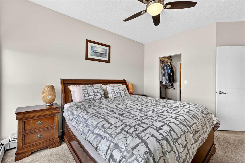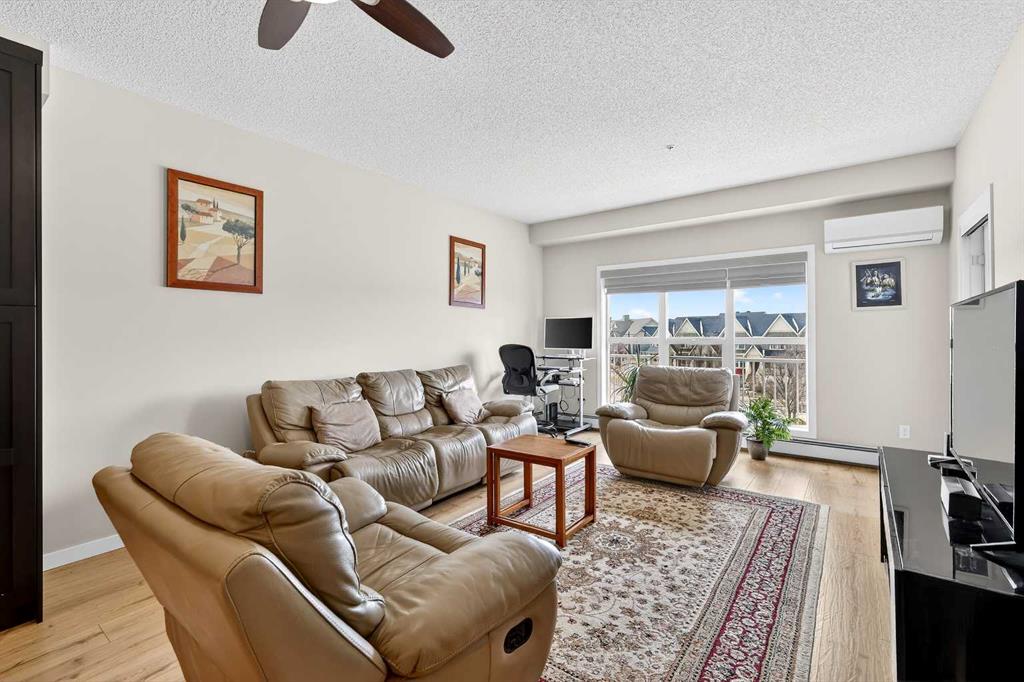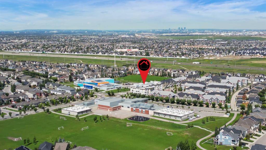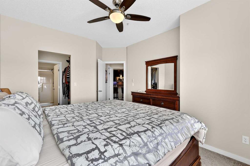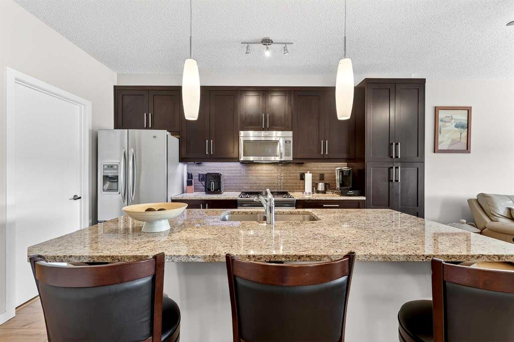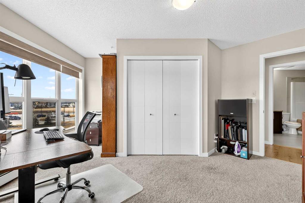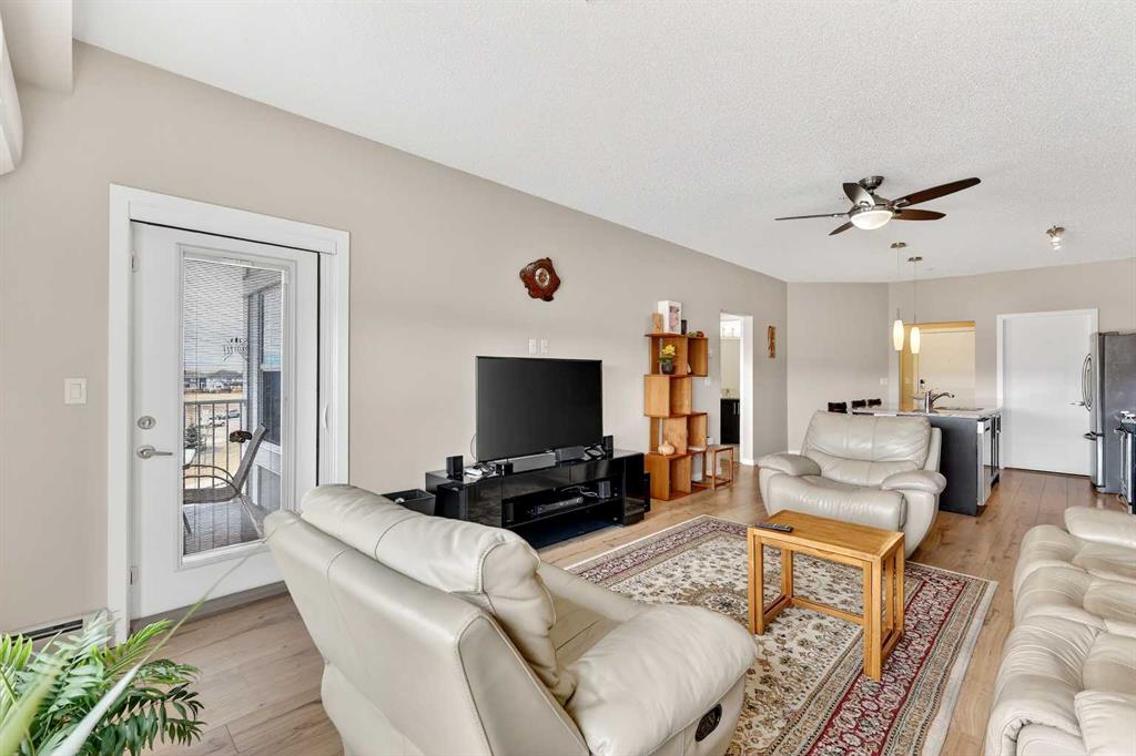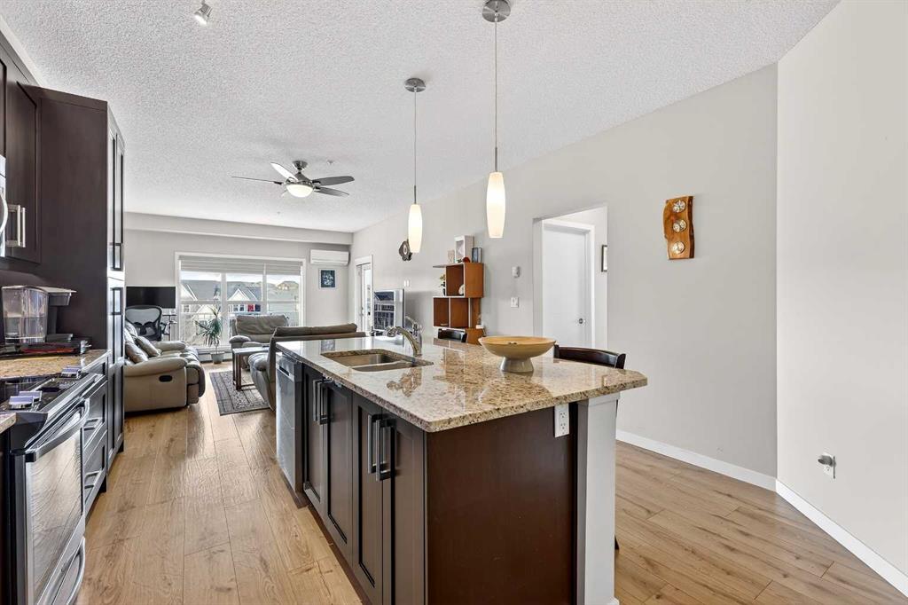 Welcome to Ebony in Mahogany—where elevated condo living meets the beauty and lifestyle of Calgary’s premier lake community. Perfectly positioned on the third floor with a coveted southwest exposure, this stunning and spacious apartment offers one of the largest floorplans in the complex, paired with an abundance of natural light and thoughtful design that sets it apart from the rest. From the moment you step inside, you are greeted by soaring ceilings just under 9 feet and oversized windows in both the living room and primary suite—creating a bright, open atmosphere that feels expansive and inviting. Bathed in warm evening sunlight, this home offers a truly special ambiance to be enjoyed throughout all four seasons. The kitchen is both stylish and functional, featuring rich dark cabinetry, elegant granite countertops, and a full stainless steel appliance package. A generous walk-in pantry provides exceptional storage and organization, while in-suite laundry adds everyday convenience. The kitchen flows seamlessly into the open-concept living and dining area, where warm-toned laminate flooring grounds the space and creates a cohesive, welcoming feel. The primary suite is a peaceful retreat, complete with a walk-through closet and a beautifully appointed 3-piece ensuite featuring granite countertops, timeless tile flooring, and an oversized walk-in shower with sleek glass doors. The second bedroom is equally impressive, offering a unique layout with a charming niche perfect for a reading nook, a Murphy bed for added versatility, and easy access to the 4-piece main bathroom—ideal for guests or family. This home is loaded with additional features that elevate everyday living, including air conditioning, a spacious private deck with BBQ gas line, and the rare bonus of two tandem parking stalls. Residents of Ebony also enjoy access to an on-site fitness facility, playground, visitor parking, and the added peace of mind that comes with nearby traffic-calming school zones. The location is simply unbeatable—just a few blocks from Mahogany’s private lake and beach club, and directly across the street from two schools. Enjoy endless opportunities for outdoor living with nearby parks, pathways, and playgrounds, along with convenient access to shopping, dining, and major routes in and out of the community. This is more than a condo—it’s a lifestyle defined by light, space, and the vibrant energy of lake living. If you’ve been searching for a home that offers exceptional design, incredible exposure, and everyday comfort in one of Calgary’s most sought-after communities, this is the one.