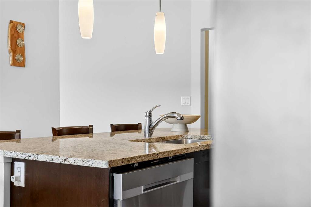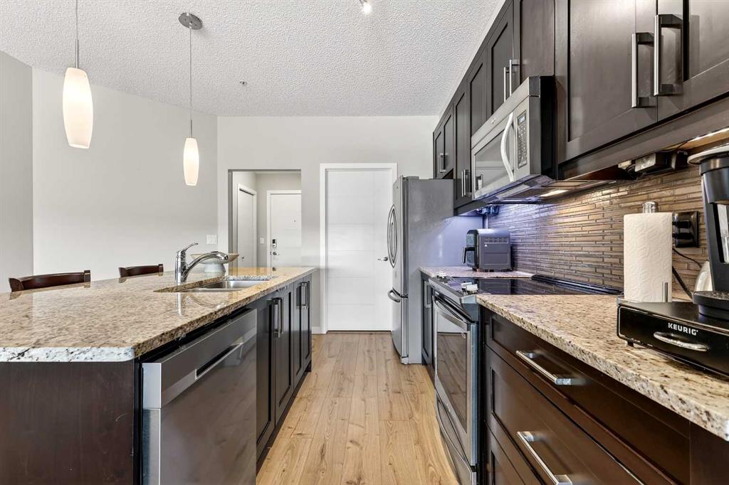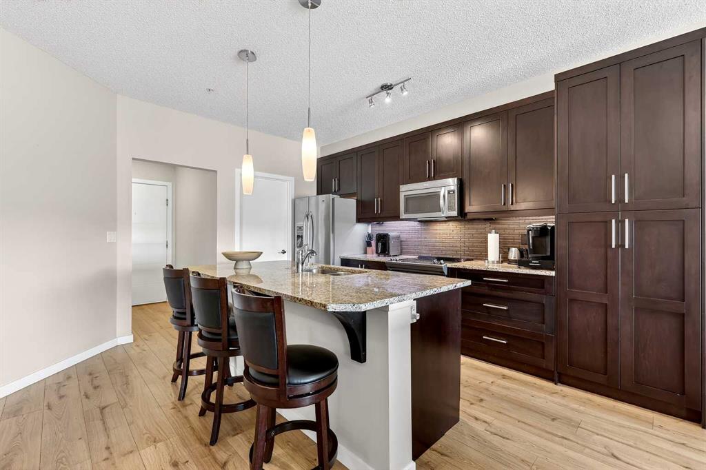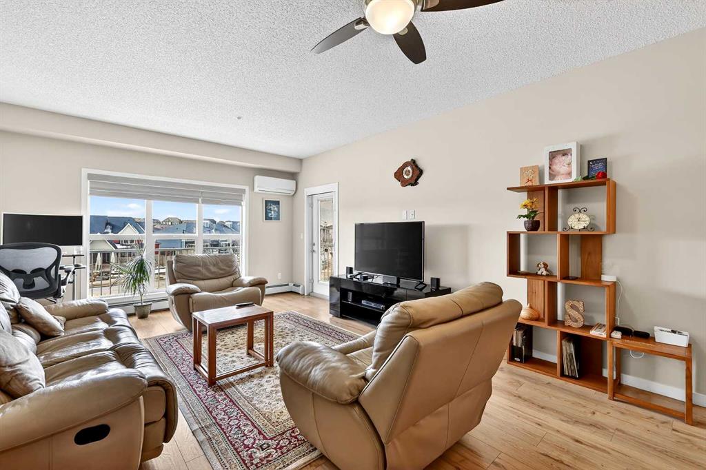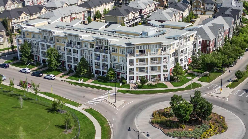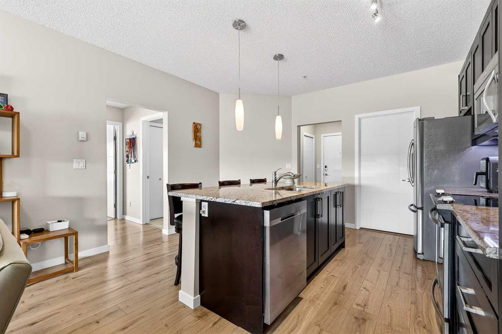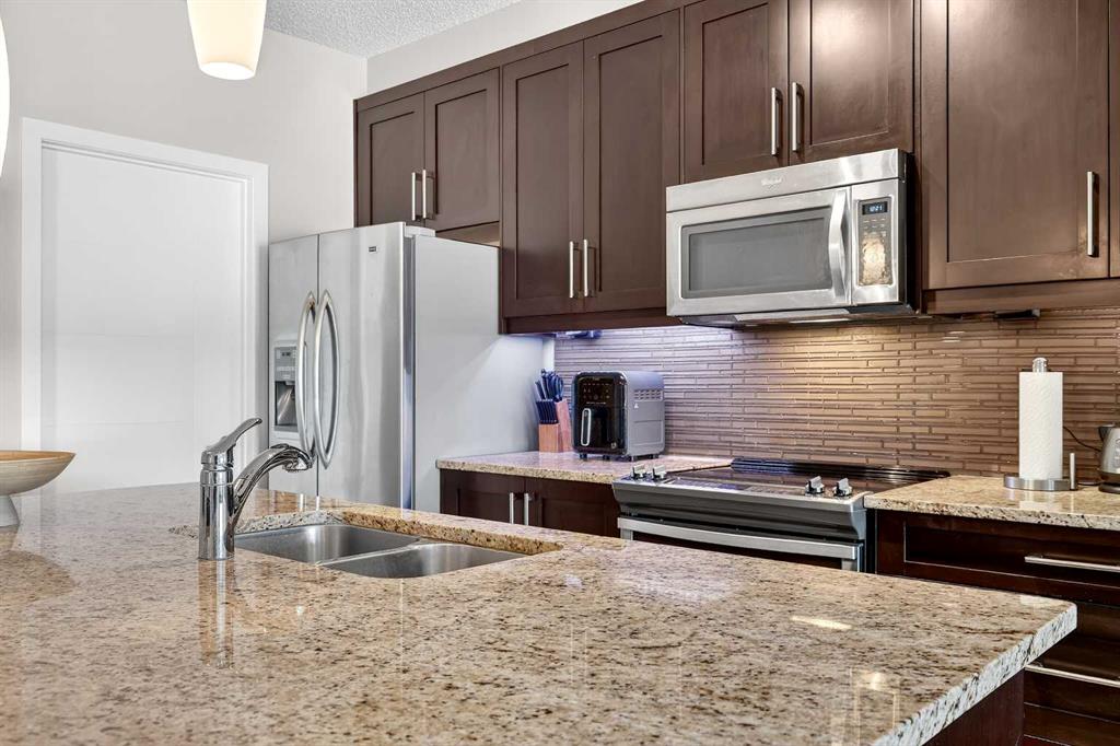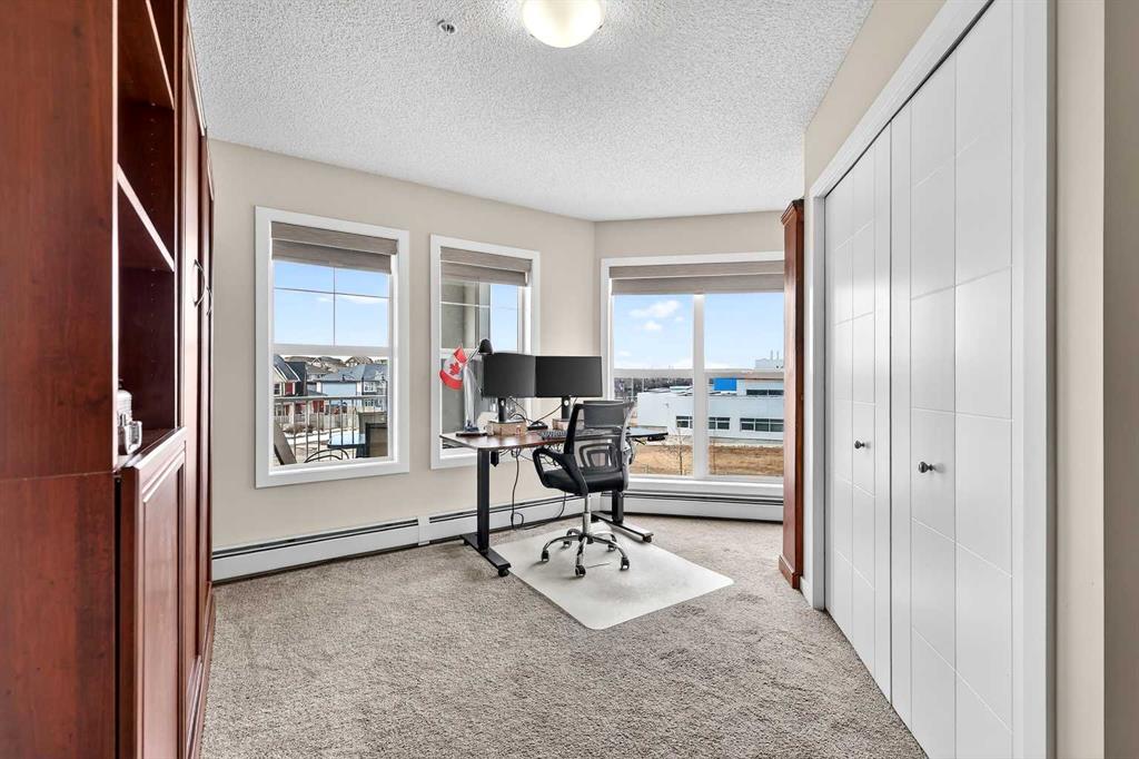 Welcome to Ebony in Mahogany—where elevated condo living meets the beauty and lifestyle of Calgary’s premier lake community. Perfectly positioned on the third floor with a coveted southwest exposure, this stunning and spacious apartment offers one of the largest floorplans in the complex, paired with an abundance of natural light and thoughtful design that sets it apart from the rest. From the moment you step inside, you are greeted by soaring ceilings just under 9 feet and oversized windows in both the living room and primary suite—creating a bright, open atmosphere that feels expansive and inviting. Bathed in warm evening sunlight, this home offers a truly special ambiance to be enjoyed throughout all four seasons. The kitchen is both stylish and functional, featuring rich dark cabinetry, elegant granite countertops, and a full stainless steel appliance package. A generous walk-in pantry provides exceptional storage and organization, while in-suite laundry adds everyday convenience. The kitchen flows seamlessly into the open-concept living and dining area, where warm-toned laminate flooring grounds the space and creates a cohesive, welcoming feel. The primary suite is a peaceful retreat, complete with a walk-through closet and a beautifully appointed 3-piece ensuite featuring granite countertops, timeless tile flooring, and an oversized walk-in shower with sleek glass doors. The second bedroom is equally impressive, offering a unique layout with a charming niche perfect for a reading nook, a Murphy bed for added versatility, and easy access to the 4-piece main bathroom—ideal for guests or family. This home is loaded with additional features that elevate everyday living, including air conditioning, a spacious private deck with BBQ gas line, and the rare bonus of two tandem parking stalls. Residents of Ebony also enjoy access to an on-site fitness facility, playground, visitor parking, and the added peace of mind that comes with nearby traffic-calming school zones. The location is simply unbeatable—just a few blocks from Mahogany’s private lake and beach club, and directly across the street from two schools. Enjoy endless opportunities for outdoor living with nearby parks, pathways, and playgrounds, along with convenient access to shopping, dining, and major routes in and out of the community. This is more than a condo—it’s a lifestyle defined by light, space, and the vibrant energy of lake living. If you’ve been searching for a home that offers exceptional design, incredible exposure, and everyday comfort in one of Calgary’s most sought-after communities, this is the one.