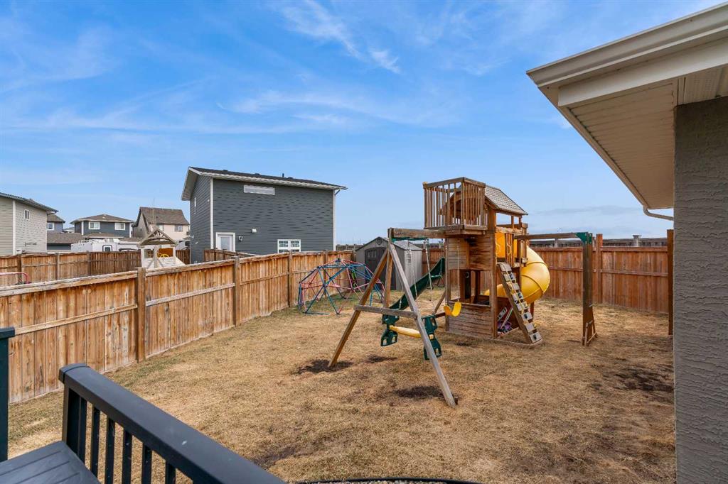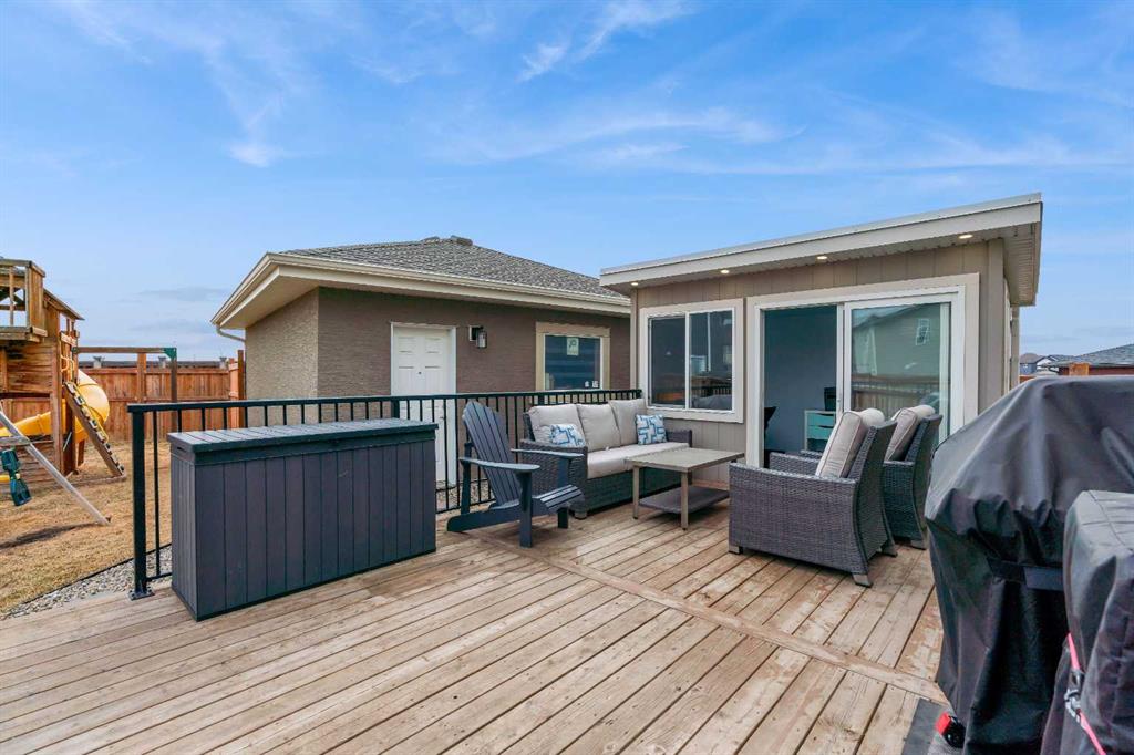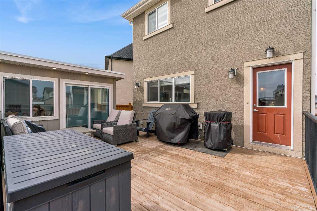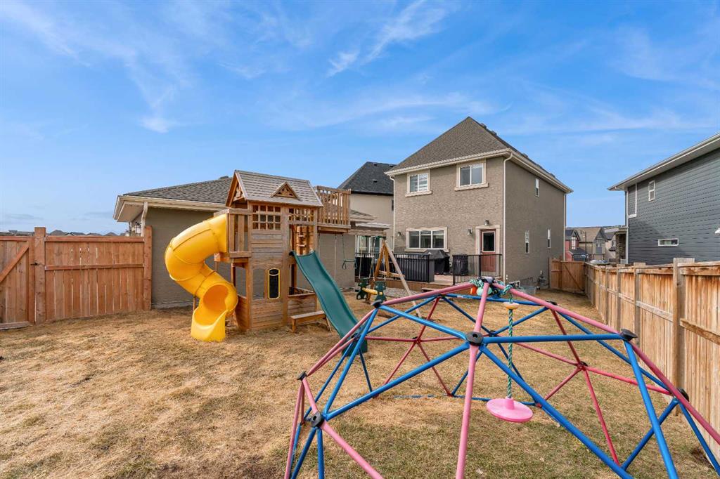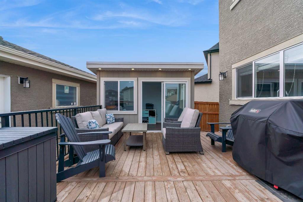 Welcome to Marquis Court! This air-conditioned, fully developed home offers over 2,200 sq. ft. of developed living space, plus a separate backyard office. The main floor features 9-ft ceilings, luxury vinyl plank flooring, and an upgraded kitchen with pot lighting, extended cabinetry, quartz countertops, white subway tile backsplash, stainless steel appliances including a gas range, a pantry, and a peninsula island with seating. The kitchen opens to a spacious dining area with an added window for extra natural light. The family room is bright and inviting, and an additional flex space provides room for a home office or whatever suits your needs. A functional mudroom with a storage bench and closet, along with a powder room, completes the main level. Upstairs, you’ll find a spacious primary bedroom with a walk-in closet and a well-appointed ensuite featuring an oversized tiled shower, double sinks, quartz countertops, and a soaker tub. There are two additional bedrooms—one with a walk-in closet and one with a closet organizer—along with the main bathroom and a convenient upper-floor laundry room with extra cabinetry and a hanging bar. The builder-developed basement includes a large rec room, bedroom, full bathroom, and plenty of additional storage. A standout feature is the separate backyard office, complete with electricity, heat, and air conditioning—an ideal work-from-home setup. The oversized backyard offers a large deck, double garage, and plenty of space to enjoy. Located just steps from the wetlands in the award-winning lake community of Mahogany, you’ll enjoy year-round amenities including beaches, skating, paddleboarding, walking paths, and parks, along with nearby schools, shopping, restaurants, and all essential services just minutes away.