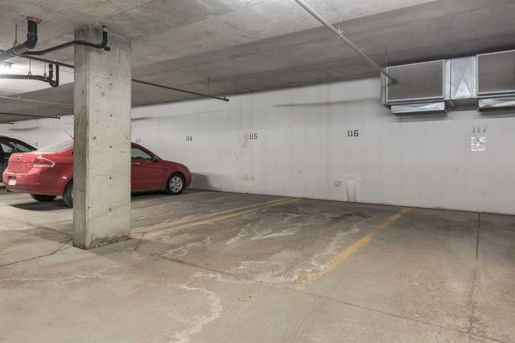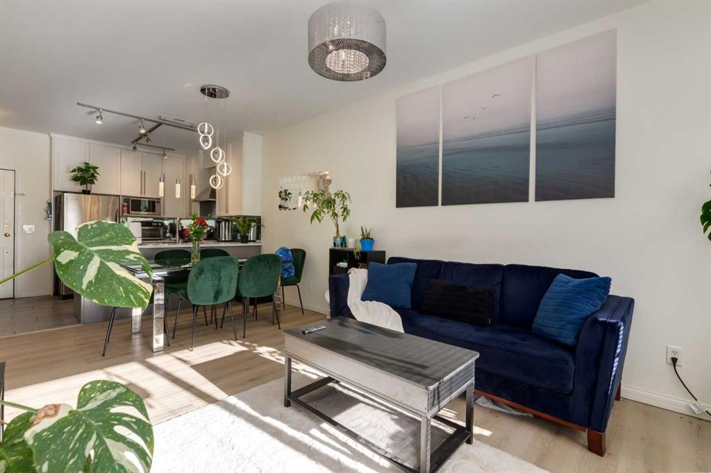 The dining area showcases a beautiful modern light fixture, while the inviting living room opens onto a spacious patio overlooking the sunny south green space. The primary bedroom includes a walk-in closet, a built-in storage wall, and blackout curtains for added comfort. In-suite laundry with extra storage space adds everyday convenience. This unit includes heated underground parking and a storage locker!