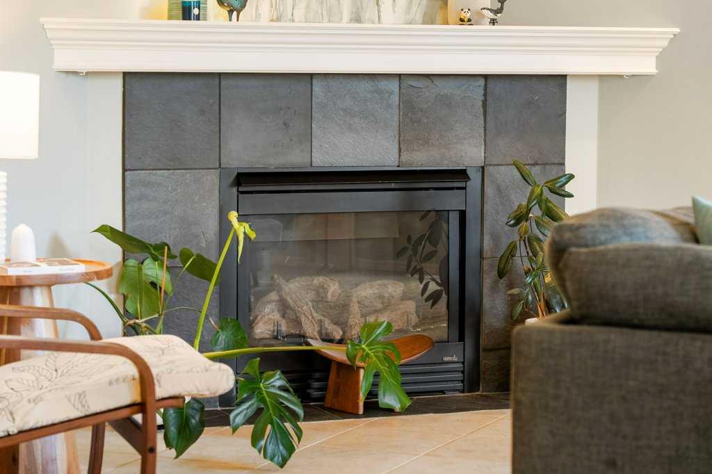 The rear of the home opens into a warm and inviting lifestyle room complete with sconce lighting and a cozy gas fireplace with tiled surround. The open-concept kitchen and dining area is designed for both everyday living and entertaining, featuring a center island, pantry, added storage, stainless steel fridge, slide-in gas stove, range hood, and tiled backsplash. The adjacent family dining area offers access to your backyard with a mudroom niche presenting custom built-in solid wood storage which walks to the vinyl deck via the garden door with phantom screen.