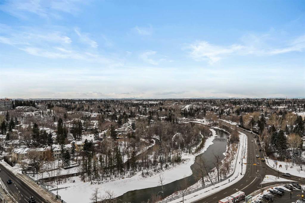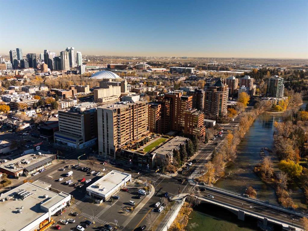 Architecturally renovated, this remarkable 2 storey penthouse delivers over 2,300 sq ft of refined living space with sweeping river valley and mountain views in the heart of Mission. Positioned within Roxboro House, one of Calgary’s most established concrete buildings, the home places river pathways, restaurants, cafés and downtown access within an easy walk while maintaining a quiet elevated setting above the city. Dramatic double height ceilings define the main living space where floor to ceiling windows frame expansive views and fill the interior with natural light throughout the day. Custom millwork and built-in library shelving introduce architectural character while a striking Bocci designer light installation creates a sculptural focal point above the living area. Marble fireplace surrounds add warmth and elegance while hardwood flooring extends throughout the home to create a cohesive and timeless finish. Entertaining flows easily between the living and dining areas where open sightlines toward the river valley form an impressive backdrop for gatherings. Quartz countertops and a full height quartz backsplash highlight the beautifully renovated kitchen where extensive custom cabinetry and a large central island support both daily routines and larger entertaining. Walk-in pantry storage keeps the space organized while built-in speaker wiring enhances the atmosphere for hosting. Adjacent bar cabinetry incorporates three wine fridges with capacity for approximately 750 bottles, creating a dedicated entertaining feature rarely found in condominium living. Upper level design introduces a flexible den retreat with its own fireplace and access to a second balcony, offering an ideal setting for a home office, lounge or private reading space overlooking the city skyline while an included Murphy bed allows the space to easily accommodate overnight guests when needed. Primary bedroom accommodations prioritize comfort and privacy through large windows, blackout blinds and extensive custom storage solutions. Heated floors in the lavish ensuite provide everyday comfort while modern fixtures enhance the spa-inspired atmosphere. Air conditioning supports year-round comfort and upper level laundry adds everyday convenience. Two private balconies extend the living space outdoors while showcasing panoramic mountain and river views. Tandem underground parking accommodates 2 vehicles and an assigned storage unit adds valuable extra space. Roxboro House residents enjoy secure entry with front desk service along with exceptional amenities including an indoor pool, hot tub, sauna, fitness room, woodworking shop, library and billiards lounge, party room and a beautifully landscaped sky terrace with BBQ areas and outdoor gathering spaces. Mission remains one of Calgary’s most vibrant inner-city neighbourhoods where river pathways, parks, restaurants and boutique shopping create an exceptional walkable lifestyle just minutes from downtown.