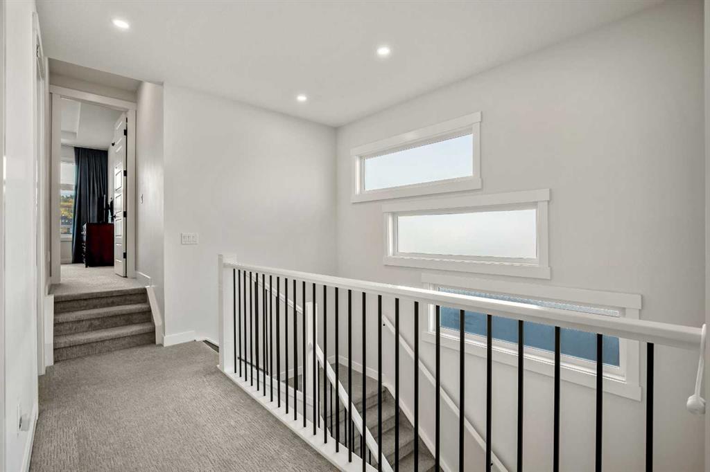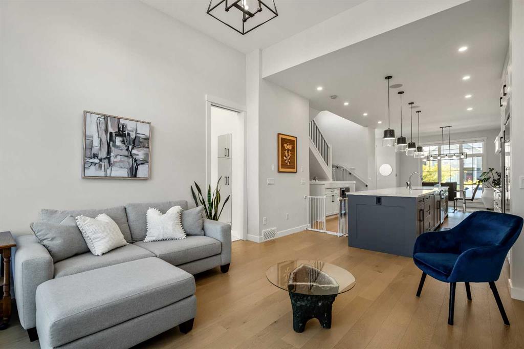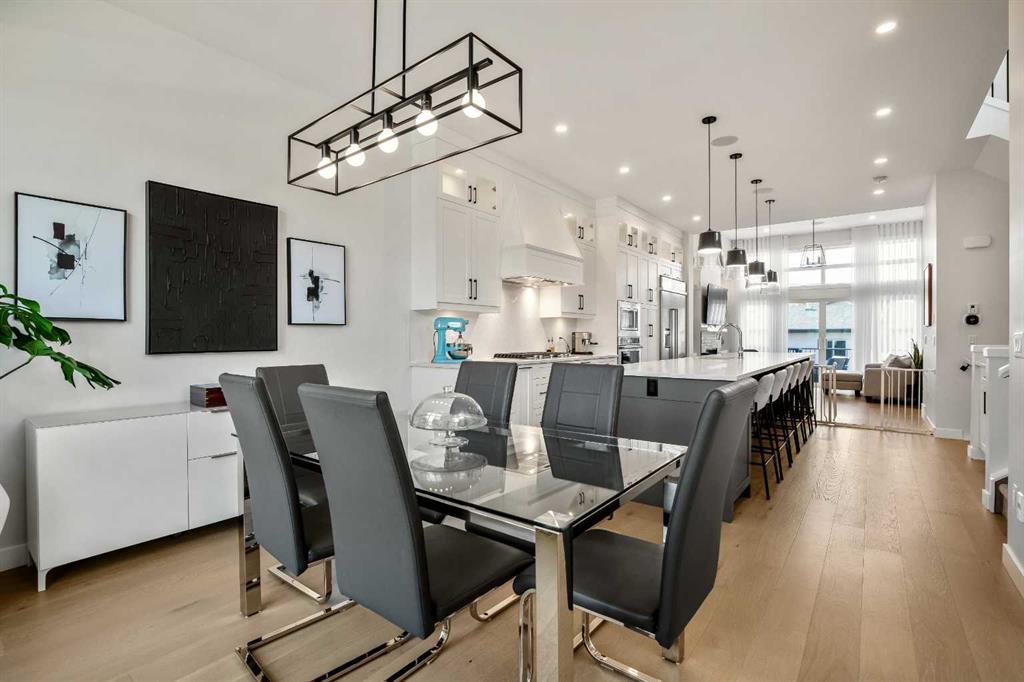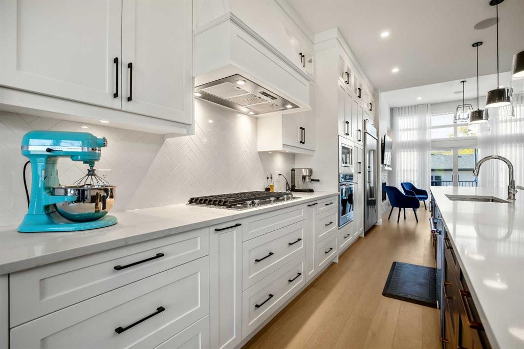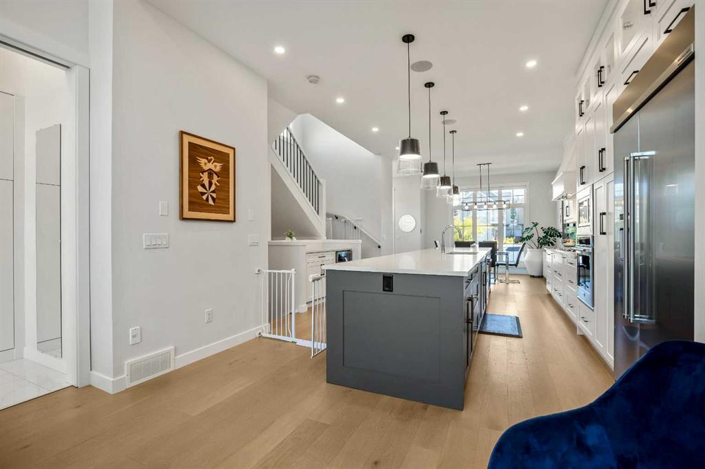 Situated on a quiet street in the highly sought-after community of Montgomery. As you enter this stunning home you will notice the abundance of natural light and that no detail was overlooked from the luxurious wide plank hardwood floors, high paint finish ceilings, 8’ solid core doors, elegant railing, in ceiling speakers and designer lights. The spacious front dining room opens to the central gourmet kitchen. This is a focal point with an expansive 16’ kitchen island, gorgeous quartz counters, a timeless herringbone tile backsplash, SS built in appliances including a gas cook top and wine fridge. All highlighted by a custom wood hood, two-tone cabinets that reach to the ceiling with glass inserts, under-cabinet lights, slow-close cabinet doors, as well as plenty of storage with additional built-in features such as spice racks and pull out details. The kitchen opens to the inviting living room with soaring 12’ ceilings, a distinctive gas fireplace with brick surrounds and built ins, plus floor to ceiling patio sliders creating a great indoor outdoor space, making this home ideal for entertaining. The sunny SOUTH backyard has a low maintenance vinyl deck and a BBQ gas line ideal for gatherings. Completing the main living area is a large mudroom with bench detail and private powder room with a full vanity. Upstairs you will find two bright well sized bedrooms, a large 4 pc bath and a convenient laundry room with plenty of storage and a sink. The primary retreat is on its own separate level creating a true oasis with a tray ceiling detail, large windows and a spacious walk in closets with built ins. The spa inspired ensuite includes heated floors, a stunning free standing tub, a massive tile shower, dual sinks with stone counters, and a private water closet. The lower level has a great rec room with a built in media center, a full wet bar including beverage fridge, floating shelves and wine racks. A 4 pc bath and fourth bedroom with a walk in closet perfect for guests or hosting gatherings. This home also offers the comforts of air conditioning, a vacu-flow rough in, plus a fully insulated and drywalled double detached garage with gas line rough in for a heater. Steps away from scenic parks, walking trails, cafes, restaurants and shopping. Schedule your private showing or view the virtual tour today.
