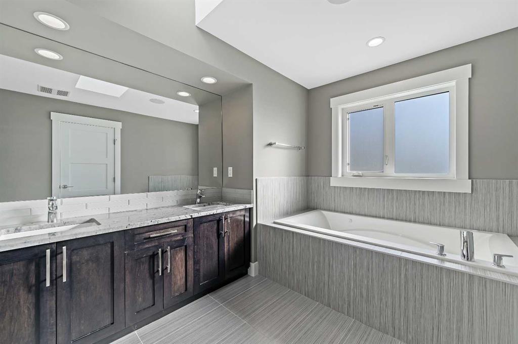 Upstairs, the primary retreat includes a large customized walk-in closet and a spa-inspired 5-piece ensuite with a large jetted tub, walk in shower and dual vanity. Two additional bedrooms, central 4-piece bath, and a well-appointed laundry room complete the upper level.