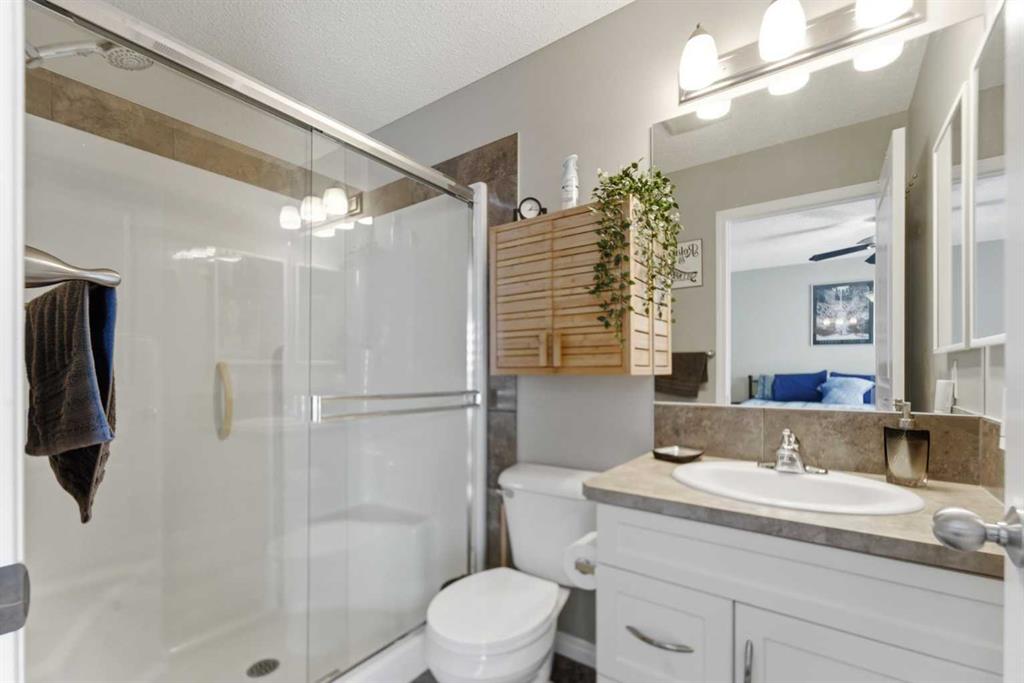 Welcome to this Stunning End Unit, multi-level open-concept townhome located on a quiet, cul de sac location. This meticulously maintained home boasts bright interiors with soaring 12-foot ceilings and an abundance of natural light streaming through floor-to-ceiling windows. Upstairs, you'll find two master bedrooms, each with a full en-suite and walk-in closet. The heart of this home is its spacious and beautifully appointed white kitchen, featuring tile flooring, ceiling-height upper cabinets, a raised eating bar, pantry, and coffee bar area. The open-concept dining room has an updated ceiling fan light, it overlooks into the living area, creating an inviting space for entertaining. Additionally, there's a convenient half bath on the main floor. Step outside to your private fenced patio, perfect for enjoying summer evening barbecues. The lower level offers a generous storage/laundry area and access to the double attached garage. Located just minutes away from shopping, transit, hospitals, schools, and with easy access to Deerfoot and Stoney Trails, this home combines convenience with comfort. Plus, enjoy the added benefit of low condo fees covering yard maintenance, snow removal, and annual window cleaning. Recent upgrades include Zebra window coverings throughout and a newer washer and dryer, new fridge in the kitchen and second fridge in basement new hot water tank, upgraded lighting throughout. Book your viewing today!