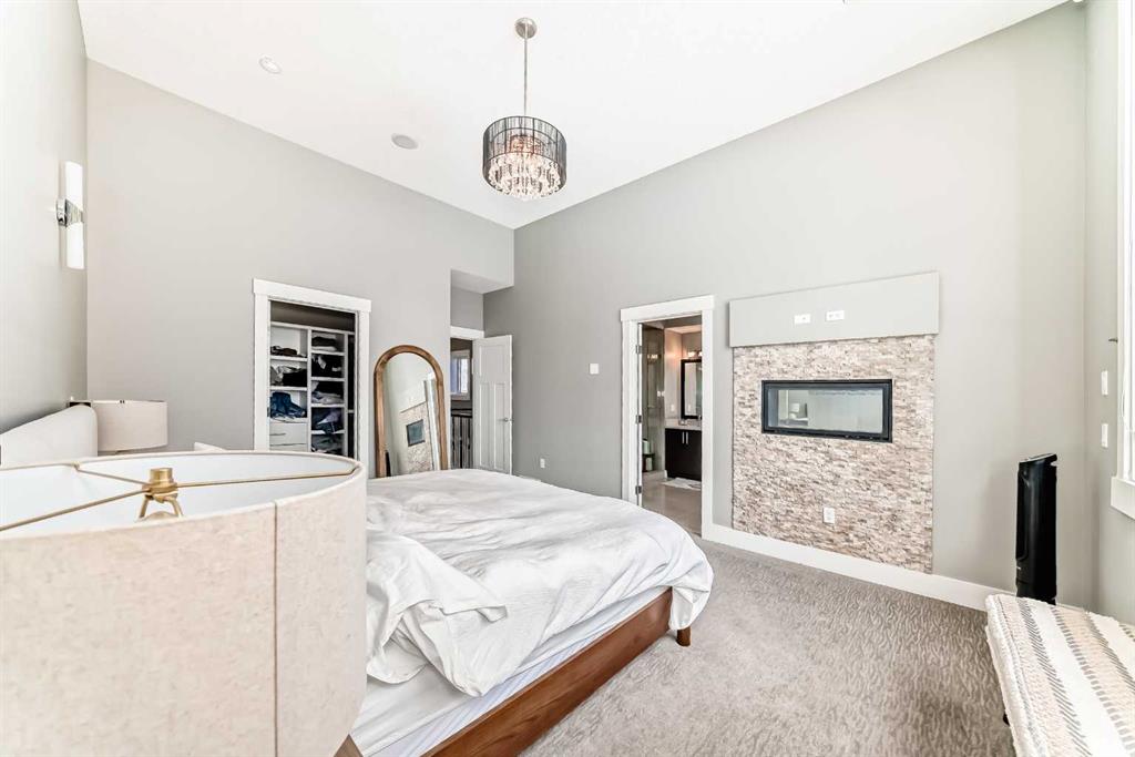 Upper Floor: 12-foot ceiling primary bedroom with a double-sided fireplace, spa-like ensuite, custom walk-in closet, and two additional spacious bedrooms