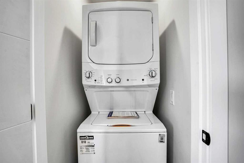IN BASEMENT: REFRIGERATOR, ELECTRIC RANGE, MICROWAVE HOOD FAN AND WASHER/DRYER STACKED. |