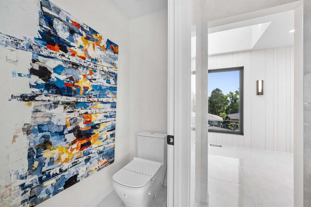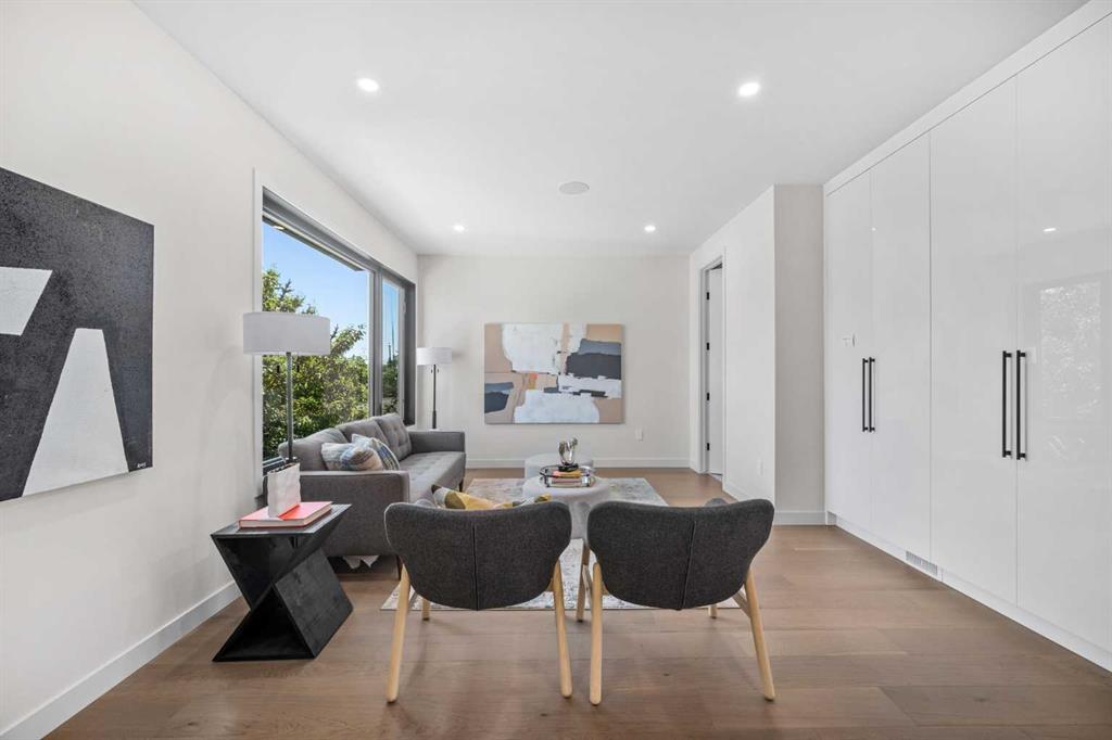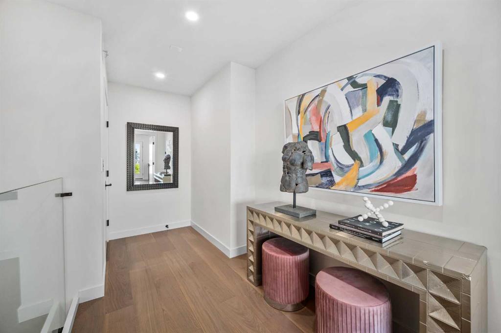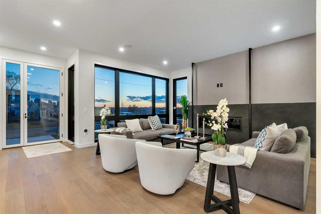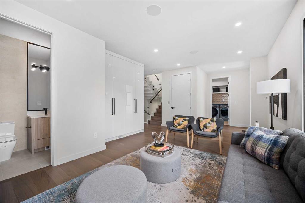 An architectural masterpiece by Silverpoint Custom Homes and Paul Lavoie Interior Design. Perched on a spectacular lot overlooking Bridgeland, and offering breathtaking views of the City and Rocky Mountains. A 5,200-square-foot gem, which seamlessly blends Hollywood Hills vibes, in a meticulous and one of a kind design. A fantastic open floor plan with a separate formal living and dining rooms overlooking the city. Boasting a truly magnificent kitchen, featuring a 13ft waterfall island and all MIELE appliances. Hardwood floors weave throughout the four levels including the basement, creating a harmonious atmosphere of seamless design. The main level surprises you with a hidden coat closet, a spacious mudroom, and a private den overlooking a backyard oasis with a large deck, (hot-tub ready) Move effortlessly between levels via the elevator or a captivating floor to ceiling glass-walled staircase leading to three generous bedrooms and a master top suite, simply like no other. The second floor offers 3 spacious bedrooms with panoramic city views from 2 bedrooms, private balconies, and a separate family lounge with access to a full guest bath. A fabulous laundry room and linen closet complete this level, not to mention large picture windows offering fulll sunrise worthy east views. The third-floor PRINCIPAL BEDROOM is a showstopper with a HUGE BALCONY showcasing the best panoramic city and mountain vews. A separate lounge area with coffee bar, fridge and a built in TV LIFT separate the bedroom area. As you enter the ensuite, flooded with natural light, a magical SMARTGLASS window gives you the option of privacy, or to enjoy the fabulous city views while soaking in the tub. A luxurious dual vanity, dual spa shower area surrounded by glass, featuring heated floors and shower bench. The walk-in wardrobe suite is a one of a kind dream space, with built in's that will rival a designer shop. Large skylights, a huge window and your own washer/dryer, make this the perfect dressing area. The lower level caters to the extended family and features a media area with full bar, gym, and a large bedroom. A full bath including a steam shower completes this level with all heated hardwood flooring. The outdoor spaces surrounding the house lets you indulge in extended year round outdoor living. A large front patio with a fire pit option, and seating lets you indulge in the west city and mountain views. The rear yard offers you a great dining space, and private relaxation areas with an optional hot tub, and a multi purpose sports area or green space. This home as expected includes all Smart home features, an elevator, extensive internal glass walls, AC, infloor heat, and an oversized garage with a full third car garage option which can be built prior to possession for the buyer at cost. An amazingly unique home with modern, yet classic design elements, encompassing every luxury option a discerning home owner would desire in their dream home.