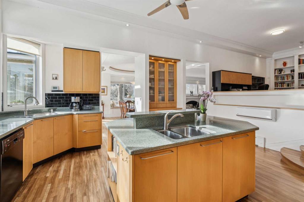The elegant living room is filled with natural light from an abundance of windows and anchored by a gas fireplace with a substantial mantel and built-in shelving. It flows into the dining area—perfect for large family gatherings—and a bright sunroom ideal for plants or a relaxing retreat. The kitchen impresses with an 11-foot ceiling, sleek Denca cabinetry, generous counter space, and large windows overlooking the stunning backyard.
