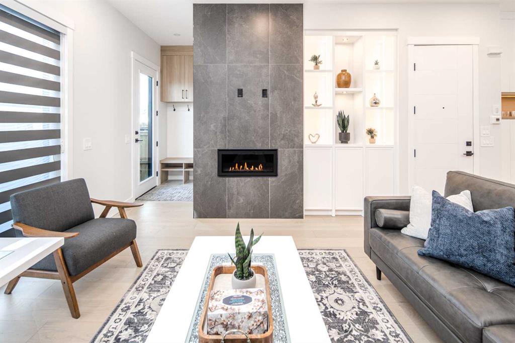 The main floor is designed to feel open and elevated, featuring 10-ft ceilings that enhance natural light flow and create a more spacious, airy environment compared to standard builds. A bright front dining area is framed by large windows, offering a welcoming space for both daily living and entertaining. At the center of the home, the chef-inspired kitchen showcases natural stone countertops, full-height custom cabinetry, a waterfall island with oak accents, LED feature lighting, and a premium appliance package—delivering both durability and a high-end finish. The adjacent living room is anchored by a floor-to-ceiling tiled gas fireplace with custom built-ins, creating a warm yet modern focal point. A dedicated main floor office provides flexibility for working from home, while the rear mudroom with built-in storage offers practical access to the backyard and garage.