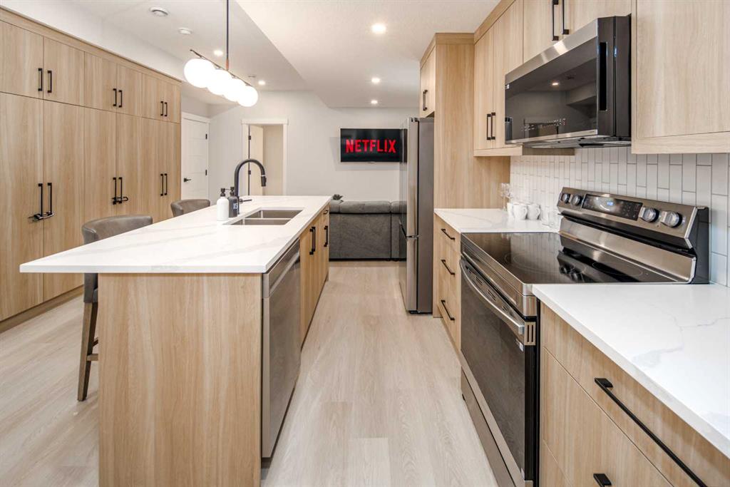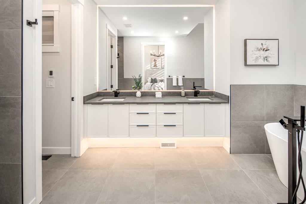 Upstairs continues with 9-ft ceilings, maintaining a consistent sense of space throughout. A versatile bonus room at the top of the stairs functions well as a secondary lounge, media area, or workspace. The primary suite is elevated by a vaulted ceiling, adding volume and a more luxurious feel to the retreat. The ensuite is thoughtfully designed with a double vanity, soaker tub, glass-enclosed shower, and in-floor heating, delivering everyday comfort during Calgary’s colder seasons. Two additional well-sized bedrooms, a full bathroom, and a conveniently located upper laundry room complete the level.
