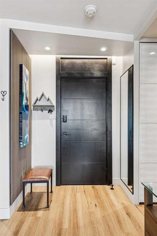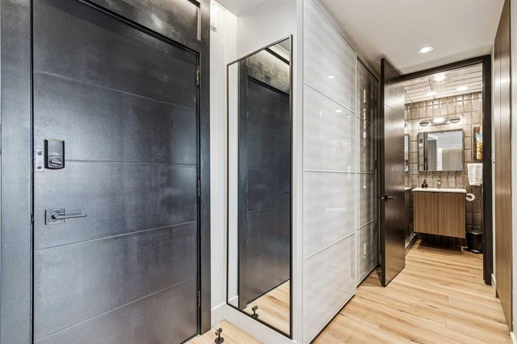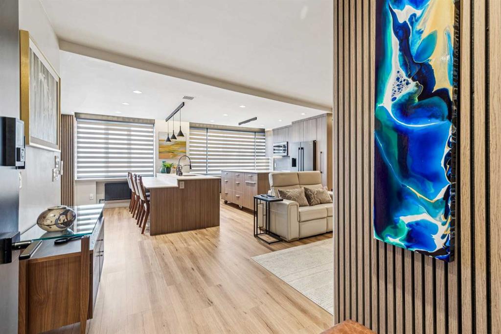 Welcome to this stunning, one-of-a-kind, luxury apartment in the highly desirable Rideau Towers. A little over two years ago, this unit was completely stripped down and redesigned into a gorgeous executive condo using top-of-the-line finishes throughout. This is a $200,000+ renovation!!!! Perfect as a corporate rental unit for visiting employees, a young professional couple who want to be close to the trendy 4th Street amenities, or someone with mobility needs. Upon entering you’ll feel the luxury of the beautiful and durable “stone composite” flooring with the look and feel of real hardwood. The space is flooded with natural light from the window wall which spans 30’ in length. When you don’t want all that light, just press a button and the motorized blinds will come down all together or separately depending on how you program them. The kitchen features custom-built Richelieu cabinets with a built-in slide-out pantry, hidden washer and dryer, movable island (on wheels) that allows you to reconfigure the kitchen layout, and a built-in dining area. The Dekton countertops flow throughout the kitchen, dining area and along the window ledges. The high-end appliances are mostly a stylish Black-Stainless finish and include a whisper quiet Bosch dishwasher, washer and dryer. All the lighting is from Cartwright and all on dimmer switches. The walls are finished with acoustic slated wood panels… they not only look beautiful but help with the acoustics in the apartment. The well-designed floor plan uses every square inch possible to maximize closet and storage space. Also designed into this plan is the flexibility to build a sliding wall system to separate the bedroom, and wider spaces and doorways to accommodate people with mobility needs such as wheelchair accessibility. The building entrance was recently redesigned and upgraded to include a wheelchair ramp and automatic door opening systems. The extra-large parking stall for this unit is located on the same level and about 50’ from the apartment door. This convenient parking spot is perfect for someone with an over-height or extra-long vehicle, or someone needing extra space beside the vehicle of access. Renfrew House is also a pet friendly building. This luxury apartment is priced well below replacement cost. Come view it today!!!