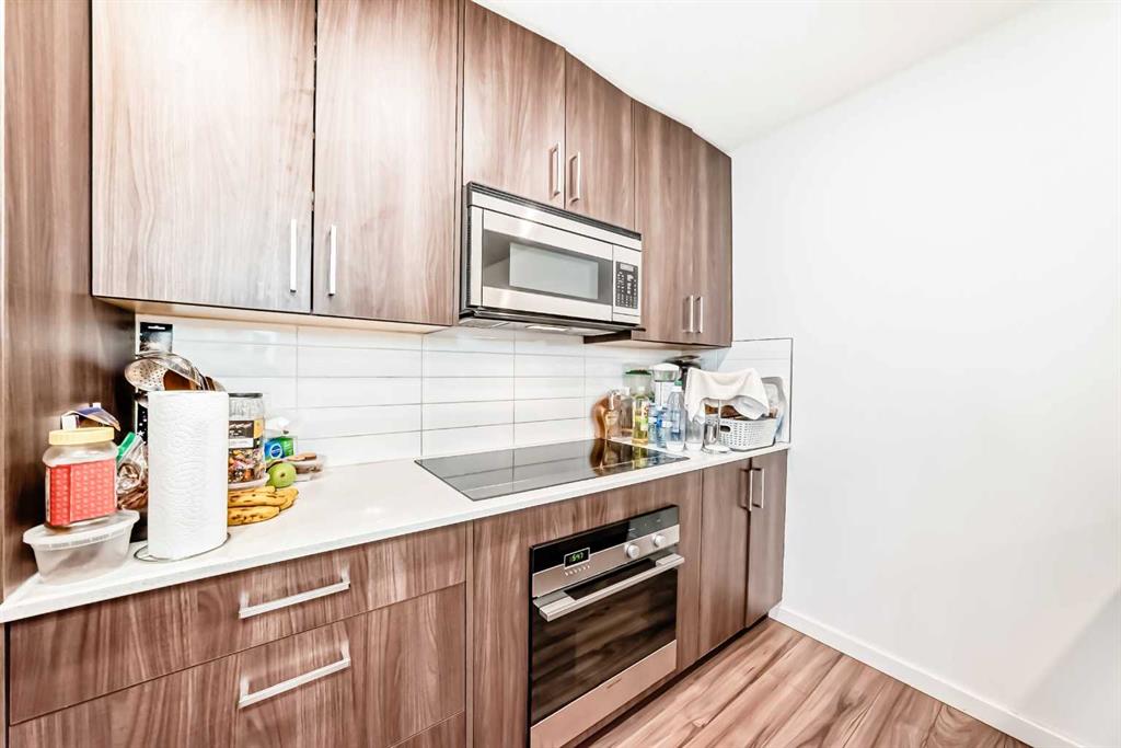 CONCRETE AND STEEL FRAME CONSTRUCTION offering superior noise reduction, reduced insurance costs, and exceptional durability. The building features high-efficiency boilers and HRV systems, with geothermal heating and cooling throughout. Equipped with Cat 5(e) wiring for advanced data and phone connectivity. This spacious 2-bedroom, 2-bathroom unit includes a den, in-suite laundry, and a titled underground parking stall. Designed with modern finishes, the interior boasts wide plank laminate flooring, bright polished white quartz countertops, and premium European-designed Fisher & Paykel appliances, including a dishwasher, induction cooktop, and convection microwave/hood fan combo. Stackable Whirlpool laundry machines are included, and the refrigerator is equipped with a microprocessor that monitors usage to extend food freshness. The primary suite features a walk-in closet and a full ensuite. Ideally located just steps from the C-Train station, shopping, and minutes from Westhills and downtown. Currently tenant occupied on a month-to-month basis—24 hours' notice required for showings.