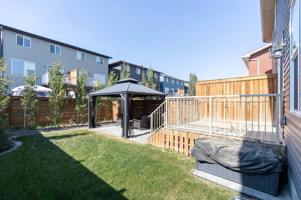 Step inside from your front-attached garage to a bright and inviting open-concept main floor, ideal for both everyday living and entertaining. A formal dining area flows into the spacious kitchen, complete with a large central island, plenty of cabinetry and counter space, and a handy pantry. The cozy living room with a fireplace opens to your private backyard oasis, featuring an elevated deck off the back door and a lower brick patio with gazebo – the perfect spot for summer evenings.