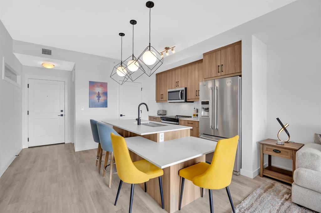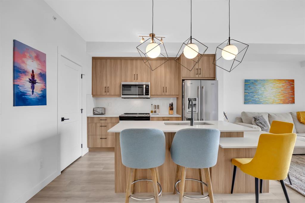 The modern kitchen has been thoughtfully updated with quartz countertops, upgraded stainless steel appliances, sleek cabinetry, and ample counter space, perfect for both everyday living and entertaining. The kitchen flows seamlessly into the dining and living areas, where you can step out onto your private balcony and take in the breathtaking west-facing mountain views and evening sunsets.