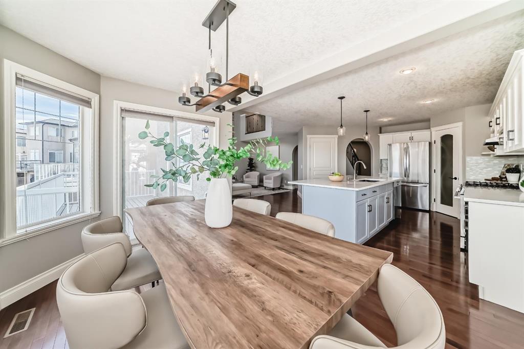 The spacious kitchen is equipped with upgraded granite countertops, a centre island with raised eating bar, and all brand new premium appliances, making it ideal for family gatherings and entertaining. Upstairs you will find three generously sized bedrooms, a flexible bonus space, and a full bathroom. The large primary suite features a walk-in closet and a bright 5-piece ensuite with bay windows, a separate shower, and a classic clawfoot tub. The fully finished walkout basement includes a fourth bedroom, full bathroom, and a large entertainment/media room with a custom wet bar and granite counters, perfect for hosting family and friends. Upgrades include updated kitchen and bathroom counters, hardwood and tile flooring, air conditioning, all new appliances, and a new roof (2025). The fully landscaped and fenced backyard features a maintenance-free deck, creating a perfect outdoor space to relax or entertain. Ideally located close to top schools, scenic pathways and ravines, shopping, restaurants, golf courses, Costco, Canadian Tire, public transit, and with easy access to Stoney Trail and Calgary International Airport. A rare opportunity to own a beautiful walkout home in one of NW Calgary’s most desirable family communities.