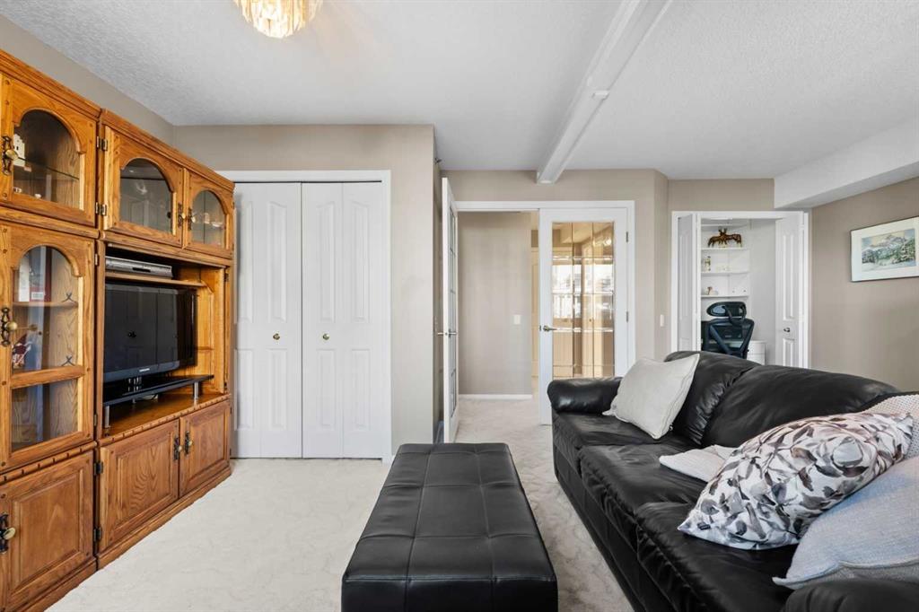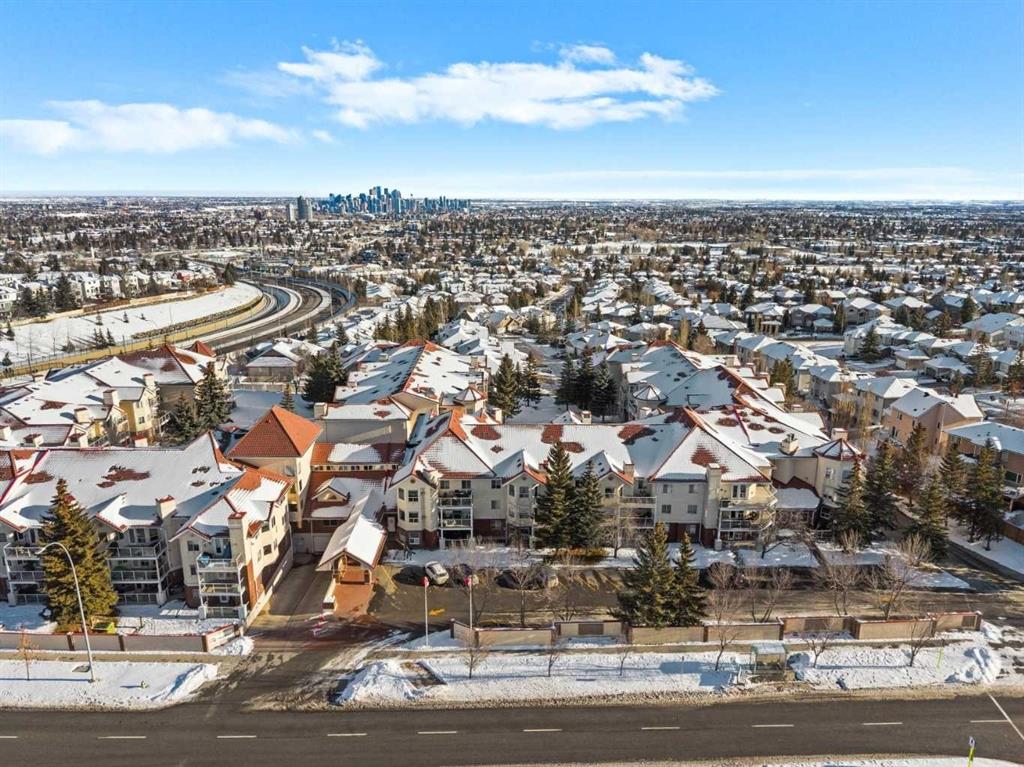 PENTHOUSE | 2 BED + LOFT | 3 FULL BATHS | VIEWS | Experience a lifestyle without compromise in this one-of-a-kind, multi-level residence boasting 1,850 sq. ft. of architectural elegance. This home seamlessly blends the convenience of a 55+ community with the sophisticated luxury of a custom penthouse. The moment you enter the open-to-above foyer, the grand scale of the home is revealed. The living area, defined by soaring vaulted ceilings and floor-to-ceiling windows, floods with natural light and frames an unobstructed, panoramic view of the Calgary downtown skyline. Whether hosting in the formal dining room or relaxing by the three-way gas fireplace, the city’s skyline serves as your permanent backdrop. Step onto the massive wrap-around patio—equipped with two retractable awnings—to enjoy the most spectacular sunrises in the city. The chef-inspired kitchen features updated stone countertops, stainless steel appliances, and a convenient breakfast bar for casual dining. The primary suite is a private sanctuary offering more stunning views, a walk-in closet, and spa-like ensuite with a large vanity, custom cabinetry, luxurious corner soaker tub, and walk-in shower. The oversized second bedroom is bathed in light and features a built-in office and Murphy bed, making it a versatile space for a family room or guest suite. It is served by an adjacent full bathroom with walk-in shower. An elegant wood-spindle staircase leads to a massive loft overlooking the living area below with more fantastic views. This unique upper level includes a gas-stove 2nd fireplace, custom-built 2nd Murphy bed/storage unit, a dedicated craft nook, and a private 3-piece bathroom with a large storage closet. Premium Features Include: Central A/C, dual gas fireplaces, luxury carpeting and custom window coverings throughout. Convenience & Storage: Central vacuum and in-suite laundry with two significant walk-in storage rooms. Parking: Underground stall with an oversized, adjacent storage unit. Privacy: Located in a quiet wing of the building with direct elevator access. More than a home, Dana Village is a vibrant community. Stay active with a social calendar featuring weekly outings, coffee mornings, and fitness classes. The beautifully landscaped inner courtyard offers a serene, park-like setting for morning walks or visiting with neighbours. Residents enjoy exclusive access to an array of top-tier amenities, including a fully equipped fitness centre, a peaceful library, and a games room for billiards & puzzles. Hobbyists will love the dedicated woodworking workshop, and the heated underground parkade features its own car wash bay. The heart of the building is the central dining hall and community kitchen—ideal for resident potlucks, frequent social events and celebrations. Located steps from the 69th St LRT, Sunterra Market, Medical Centres and Westside Recreation Centre; this is the pinnacle of active adult living in Signal Hill. Don’t miss this rare opportunity—Call for a private viewing today