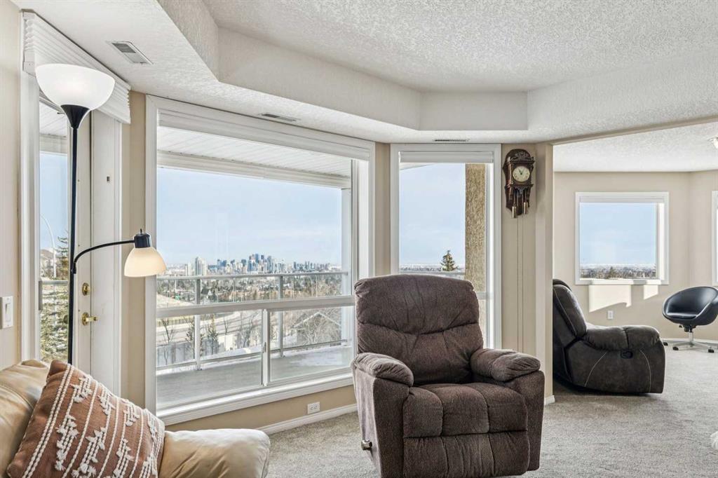 **Open House Saturday Jan 10 from 2-4pm** Experience stunning, unobstructed panoramic city views from this spacious 1,345 sq. ft. apartment-style condo in Dana Village! You can enjoy the views from most rooms in the condo. Warm and inviting and designed with open-concept living in mind, the kitchen features stone countertops, excellent prep space, and plenty of storage, and flows seamlessly into the generous dining area — large enough for a full dining suite. The bright living room offers plenty of space to relax and provides access to the first balcony, where you can set up your BBQ and outdoor dining set. There’s a den with a picture window that works beautifully as a home office, plus a second den with charming bay windows and access to the second balcony — a perfect flex space for reading, hobbies, or quiet retreat. The primary bedroom includes a walk-through closet and 4-piece ensuite. The second bedroom is located on the opposite side of the living space for added privacy, with a 3-piece bathroom nearby. A large in-suite storage room houses the convenient stackable washer and dryer. There is assigned parking and additional storage in the parkade are also included. Dana Village is a 55+ community that offers a warm, social lifestyle with plenty of amenities to enjoy. Residents can take part in organized activities and make use of the large dining hall with a community kitchen. There’s also a garden room available to reserve for private functions. Additional onsite amenities include an exercise room, library, woodworking shop, puzzle and games area, multiple lounge spaces, two courtyards, and a car wash bay. Enjoy space, comfort, and incredible views — all in a welcoming and well-appointed adult community at Dana Village. Book your showing today!!