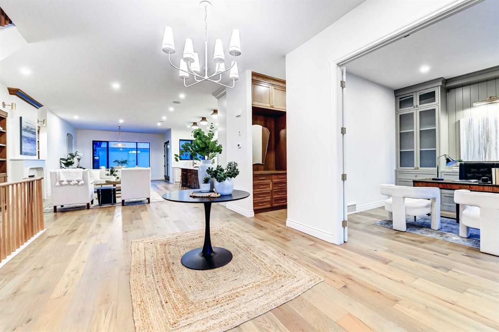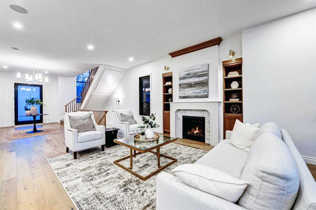 Open House Saturday & Sunday 2–4PM. Set on a quiet street in the heart of Marda Loop, The Bardot is an exceptional custom residence that blends refined French-Country character with contemporary luxury. Thoughtfully designed and built by Cedar Rock Homes with interiors curated by Aly Velji Designs, this home offers four bedrooms, 4.5 bathrooms, and a rare triple-car garage. The striking exterior showcases a sophisticated mix of stone, stucco, and Hardie panel, accented by an aluminum cedar soffit entry, statement front door, and custom aluminum Lux windows with black interior cladding. The fully landscaped and fenced backyard is designed for low-maintenance enjoyment and features a generous composite patio with aluminum and glass railing, creating a private outdoor retreat. Inside, wide plank white oak engineered hardwood flooring flows throughout all levels, complemented by solid core doors and custom site-built cabinetry with wood dovetail drawers. Soaring 10-foot ceilings on the main floor and 9-foot ceilings on both the upper and lower levels enhance the home’s bright and open feel. The main living area is anchored by a cozy gas fireplace and transitions seamlessly into the chef-inspired kitchen featuring a premium JennAir appliance package, including a 48-inch gas range, 48-inch panelled refrigerator, panelled dishwasher, and a microwave drawer integrated into the island with additional storage on both sides. A curved quartz slab island, custom cabinetry, and a bespoke hood fan create a stunning focal point, while the adjacent butler’s pantry adds extended storage and elevated lighting. The dining space is highlighted by a custom oak sideboard, and a spacious mudroom with tailored millwork ensures everyday functionality. A private front office is thoughtfully designed with French doors, floor plugs, and custom glass-front cabinetry. Upstairs, three generously sized bedrooms each feature walk-in closets and private ensuites with heated tile flooring. The primary retreat is highlighted by vaulted ceilings and a spa-inspired ensuite complete with an oversized steam shower with dual rain heads, a freestanding tub, solid slab stone backsplash, and custom hanging mirrors. A beautifully finished upper-level laundry room with sink, hanging rod, and custom cabinetry completes the floor. The fully finished basement expands the living space with a gym, TV and games area, wet bar with beverage fridge, full bathroom, and ample storage. Mechanically, the home is equipped with dual-zone high-efficiency furnaces with humidifiers, along with rough-ins for in-floor basement heating, air conditioning, central vacuum, speakers, security system, and exterior cameras. Every detail of The Bardot reflects intentional design, superior craftsmanship, and timeless appeal, all just steps from Marda Loop’s vibrant shops, restaurants, parks, schools, and only minutes from downtown Calgary
