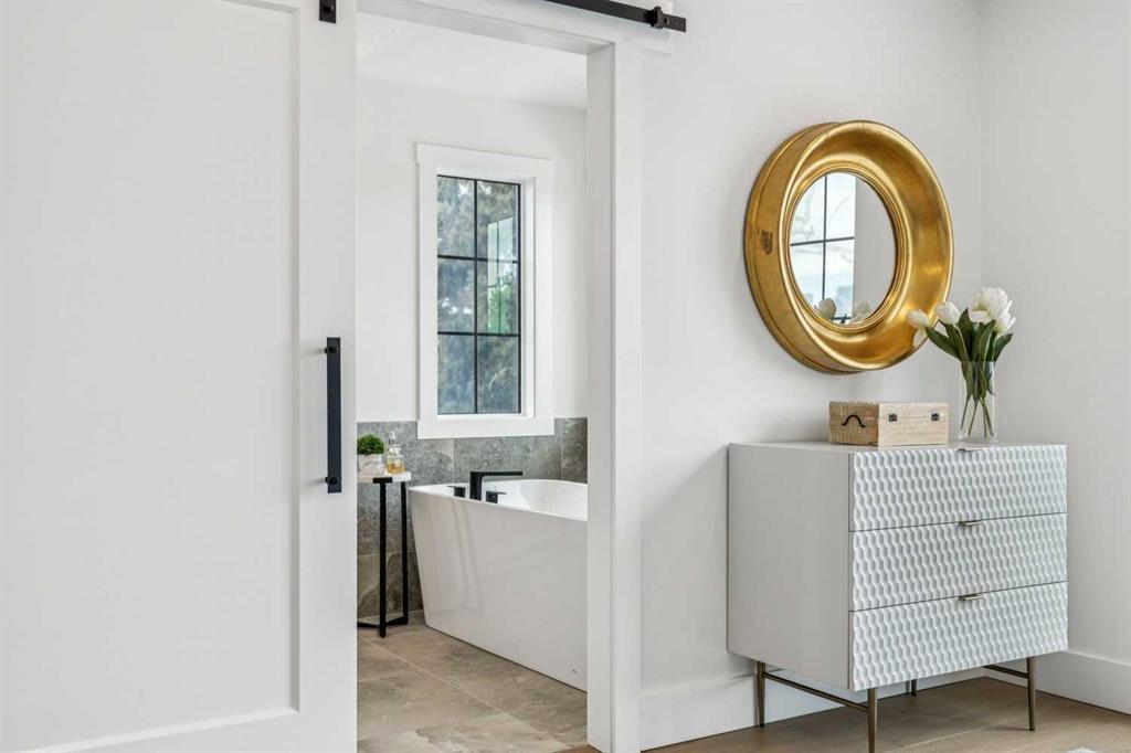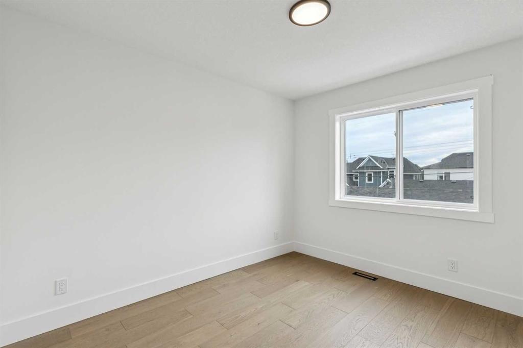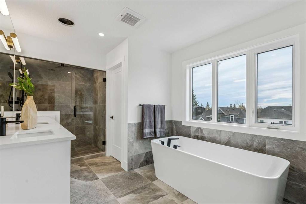 Upstairs, the primary retreat offers comfort and sophistication with oversized windows, a feature wall, a custom walk-in closet, and a luxurious 5-piece ensuite with dual sinks, a deep soaker tub, and an oversized multi-head rain shower. Two additional bedrooms, a 4-piece bathroom, and a conveniently located laundry room complete this level.