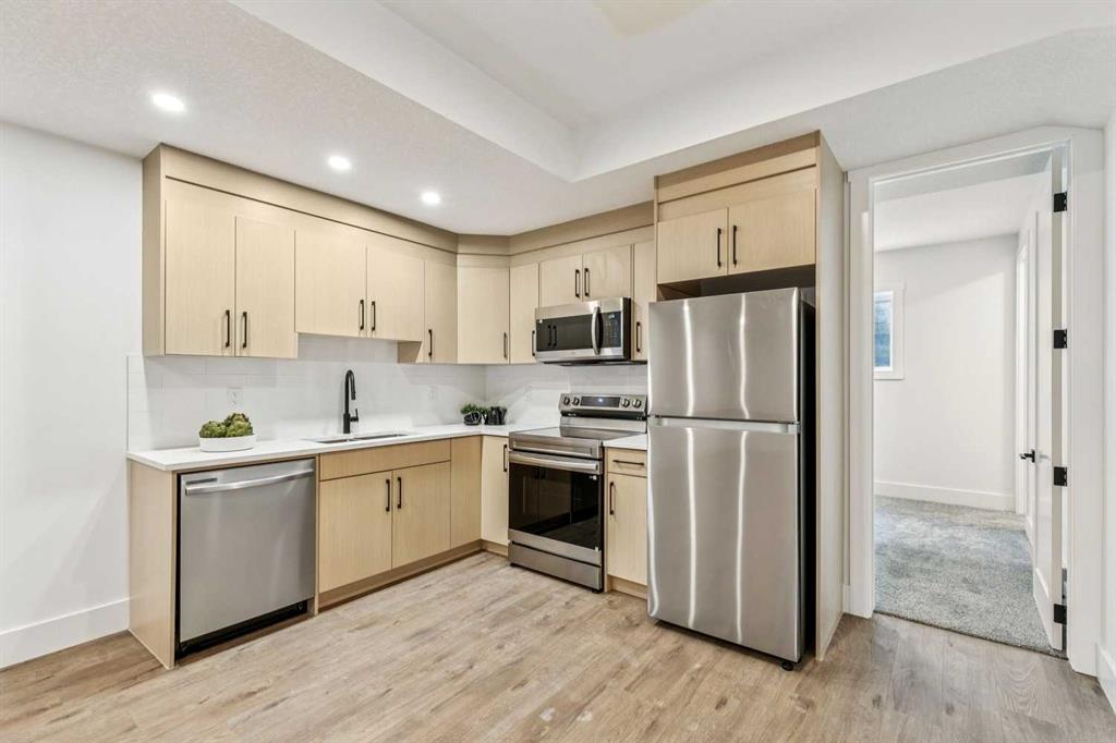 The legal basement suite provides excellent flexibility for multi-generational living or rental income. It features a private entrance, open layout, durable LVP flooring, a full kitchen with stainless steel appliances, dining space, two bedrooms, a 4-piece bathroom, and in-suite laundry.