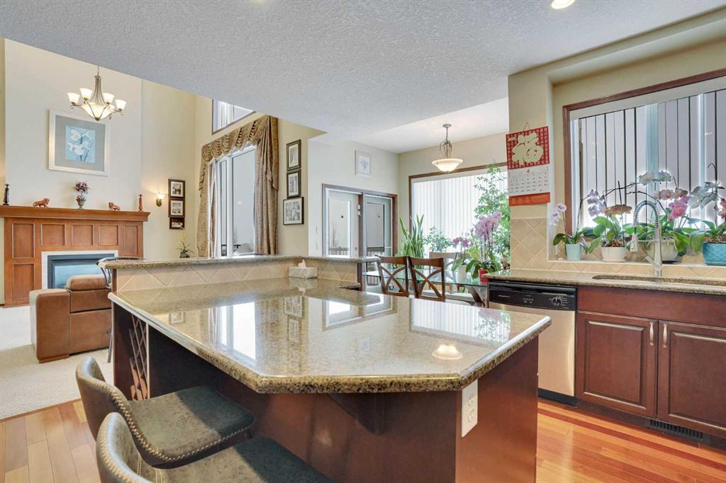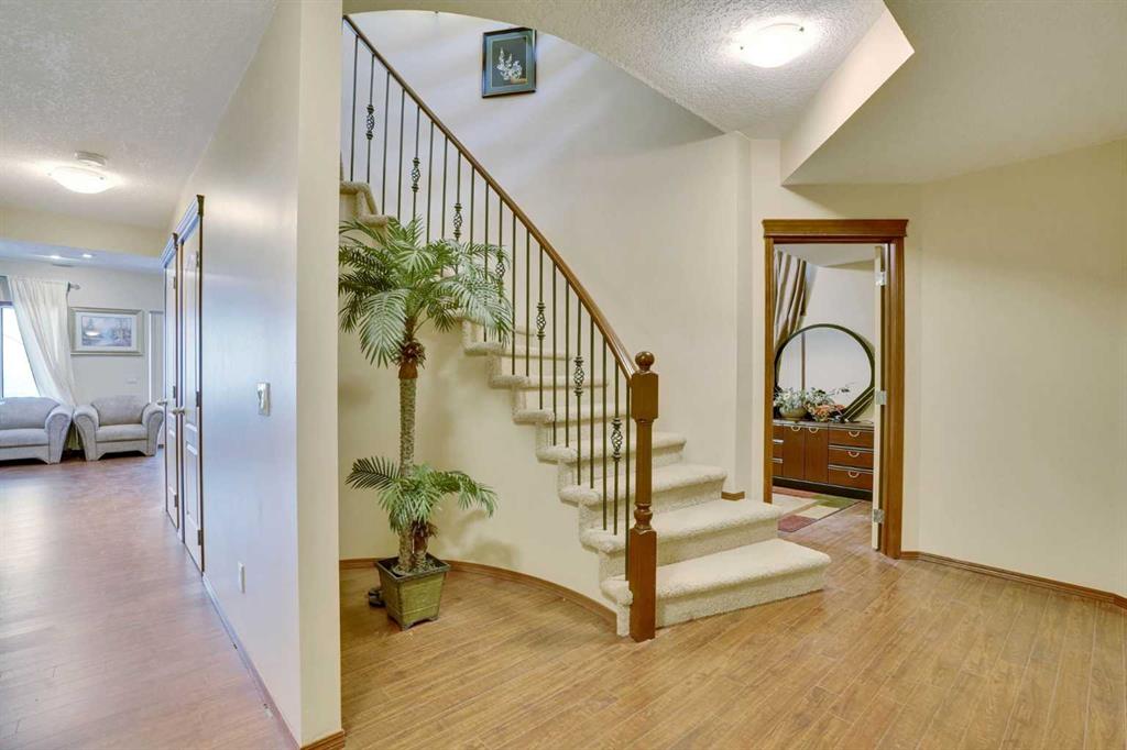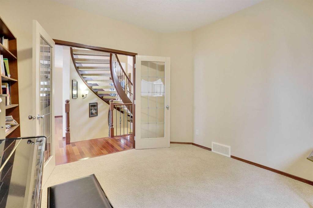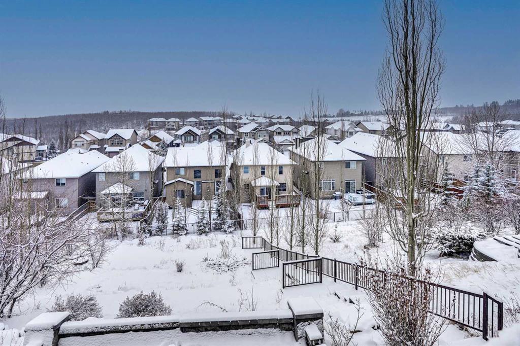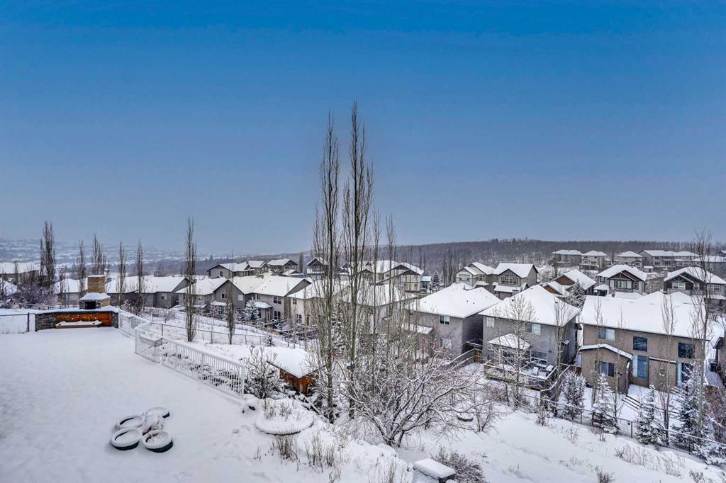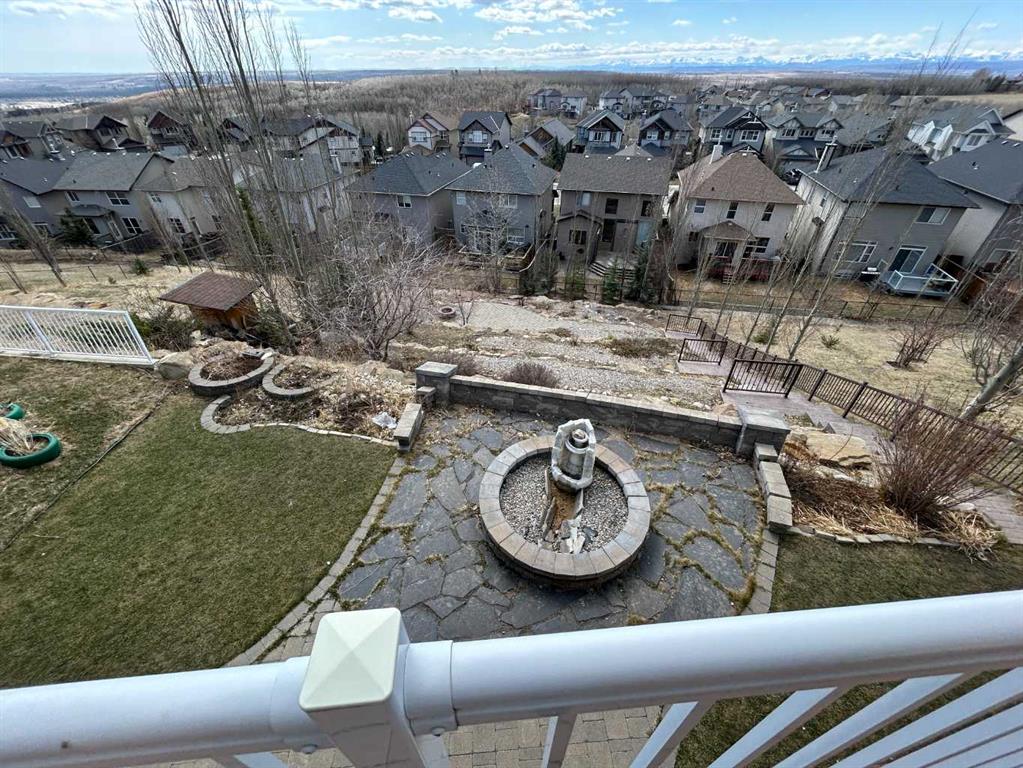 This stunning two-story house offers breathtaking views and is situated on a spacious lot of over 9,900 square feet. The attractive layout features elegant curved stairs leading from the main floor to the upper level and down to the basement. On the main floor, you will find an office, a living room with soaring ceilings, a formal dining room, a kitchen with a breakfast nook, a two-piece bathroom, and a generous mudroom. Brazilian hardwood floors create a warm atmosphere. Upstairs, the alluring staircase leads to three large bedrooms, a full bathroom, and a master bedroom complete with a cozy sitting area that showcases the spectacular view. The master suite includes a luxurious five-piece en suite bathroom and a walk-in closet. The curved staircase also leads down to the walk-out basement, which features a massive family/recreational room with a wet bar, an additional bedroom, and another full bathroom. The south-facing backyard boasts a full rear deck, a rock garden with fire pit, and beautifully designed landings and railings, creating a low-maintenance landscape. The south-facing orientation allows for plenty of sunlight. This beautiful home is located in the prestigious community of Springbank Hill, conveniently close to Calgary's excellent private and public schools, shopping centers, and a wide array of amenities.