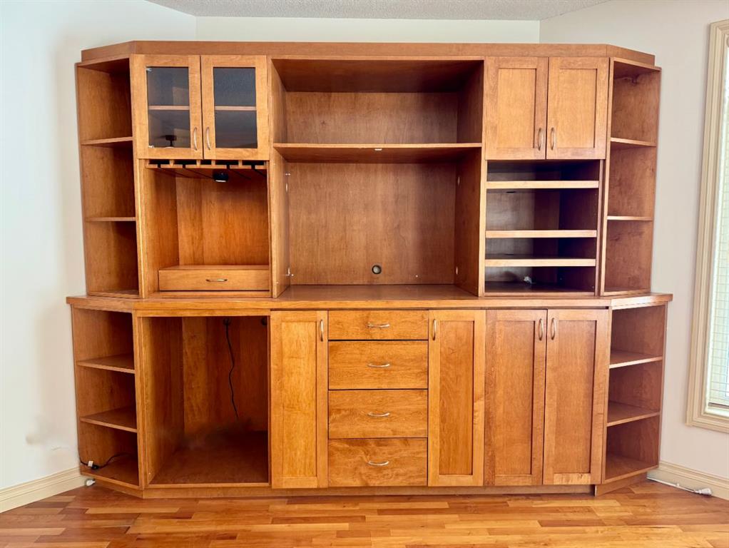 Situated within the sought-after Copperwood complex of Spruce Cliff, this main-level residence offers nearly 1,500 square feet of refined living space backing directly onto the Shaganappi Point Golf Course. The open-concept layout is defined by high ceilings and large windows that provide a bright, airy atmosphere, with hardwood flooring flowing through the great room and dining area. The living space is anchored by a gas fireplace and custom built-ins, offering a warm and inviting focal point. Just off the dining area, a private den is accessed through elegant glass French doors, providing a quiet and versatile space for a home office or library. The kitchen is designed for both style and function, featuring solid-surface countertops, stainless steel appliances, and a pantry complete with a built-in spice rack for optimized storage. The primary suite serves as a quiet retreat with ample space for a king-sized bed, a walk-in closet, and a five-piece ensuite with a soaking tub and separate shower. A generous second bedroom is complemented by a main bathroom featuring a walk-in steam shower, offering a spa-like experience at home. For added convenience, the residence includes a functional laundry room with a stacking washer and dryer and enough additional space for organized storage. This home also includes two underground parking stalls and a dedicated storage locker. Residents of Copperwood enjoy access to the Copper Club, which features a well-equipped gym, meeting room, and social lounge, along with an available guest suite for visitors. Located just minutes from downtown Calgary via Bow Trail, the property offers easy access to public transportation and the various amenities of Westbrook Mall, including Safeway and Starbucks. This home represents a refined lifestyle choice, blending the serenity of golf course views with the convenience of an established urban community.