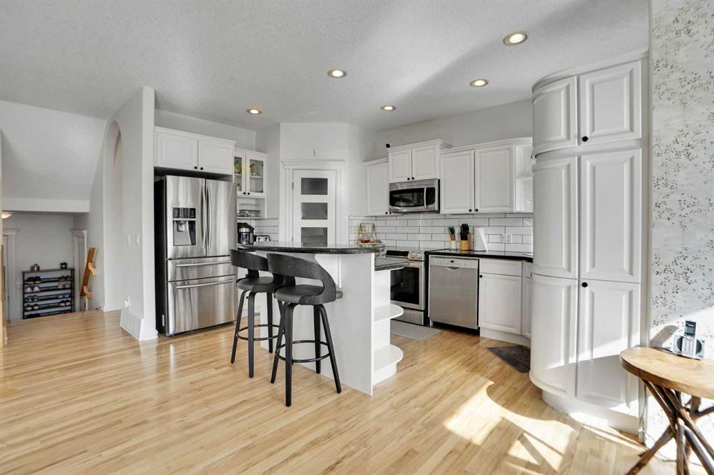 Welcome to this beautifully updated two-storey home with a rare triple attached garage in the sought-after community of Strathcona Park. Recent upgrades include refinished hardwood floors, fresh modern paint, newly painted kitchen cabinetry, central air conditioning, designer wallpaper accents, and a redesigned living room feature wall with custom built-ins and new Fireplace stone work that creates a stylish focal point. The bright open-concept main floor offers an inviting living room with a fireplace, a functional kitchen with large island, ample cabinetry, pantry, and modern appliances, plus a versatile dining area that can also serve as a home office. A laundry room and a 2-piece bathroom complete this level. Upstairs features a spacious bonus room with another fireplace, three bedrooms including a generous primary suite with ensuite, and an additional full bathroom. Hardwood flooring throughout the top two floors adds warmth and elegance. The fully developed basement includes two additional bedrooms connected by an ensuite, a flex space ideal for a gym or office, and plenty of storage. Enjoy the landscaped, fenced backyard with patio, perfect for summer gatherings. The triple car garage with drive-through access to the backyard is a rare and valuable feature. Conveniently located near excellent schools, shopping, parks, and walking paths, this move-in ready home offers space, comfort, and thoughtful updates in a prime locatio