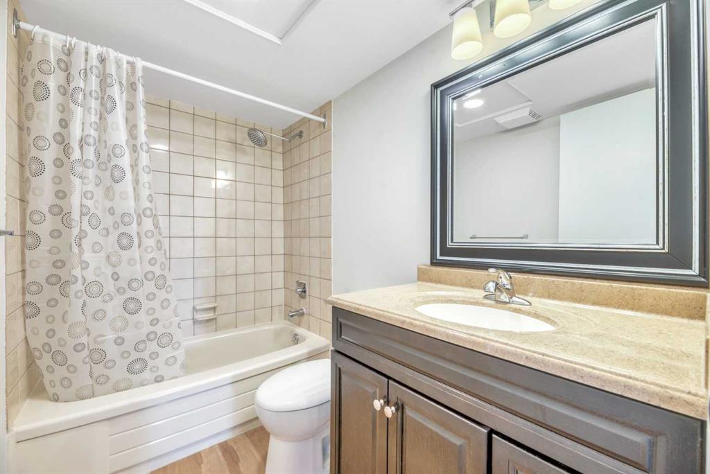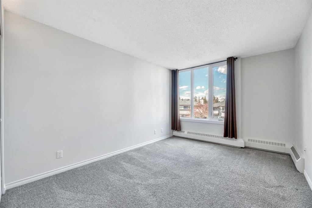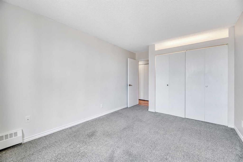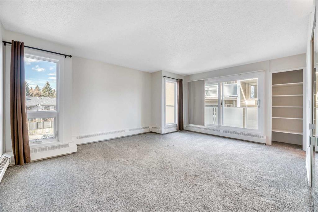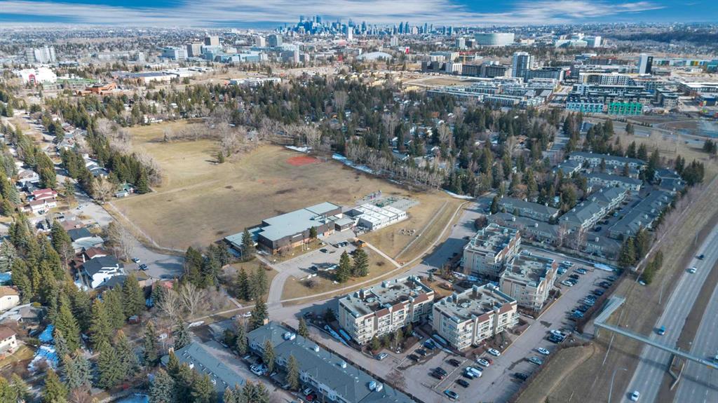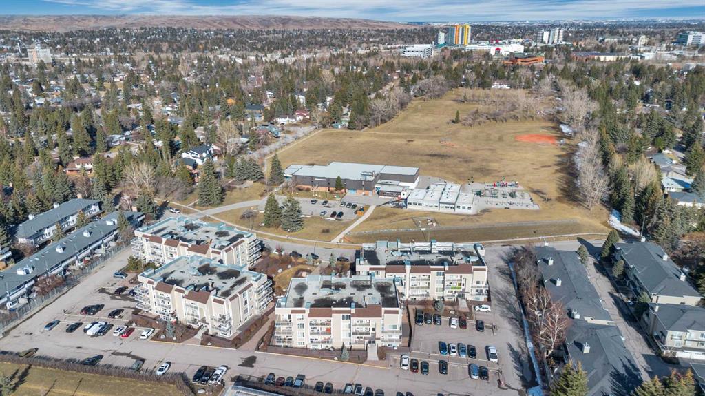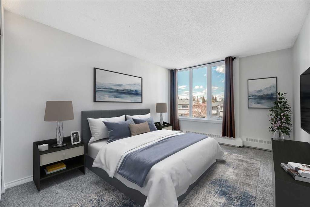Step inside to a tastefully updated kitchen featuring quartz countertops and stainless steel appliances, with updated lighting throughout the kitchen, bathrooms, and bedroom closets. At 1,127 square feet, the layout is generous and functional — a large dining area, and a sun-filled living room with expansive west-facing windows and completely unobstructed views to the west. Cozy up to the electric fireplace on those cold Calgary evenings, or step out onto one of two private balconies and soak in the sunshine.
