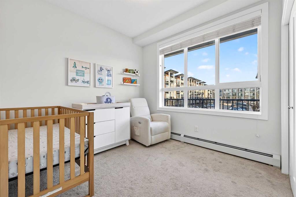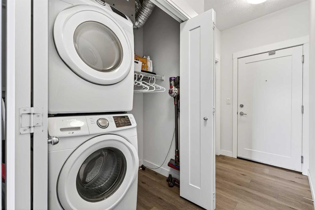 Welcome to this immaculate corner unit featuring TWO TITLED PARKING STALLS (one above ground and the other in the parkade). As you enter, you’re greeted by 9-foot ceilings, an abundance of natural light and a bright open-concept layout with durable luxury vinyl plank flooring throughout the main living space. The modern kitchen showcases modern shaker-style cabinetry with soft close drawers, quartz countertops, upgraded stainless steel appliances with a Samsung French-door refrigerator with ice maker, a sleek chimney hood fan, and a stunning marble herringbone tile backsplash. The extended island provides ample seating and is complemented by stylish pendant lighting, while a convenient pantry with built-in microwave adds extra functionality. The spacious primary bedroom features a walkthrough closet leading to a private ensuite with dual vanities. A second bedroom and full four-piece bathroom offer flexibility for guests, family, or a home office. Step outside to enjoy the generous wrap-around corner balcony complete with a BBQ gas line—perfect for entertaining or relaxing. Ideally located minutes from shopping, dining, and everyday amenities, with easy access to Macleod Trail for a quick commute. Don’t miss this exceptional opportunity—call your favourite realtor to book your private showing today.