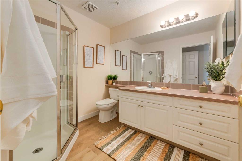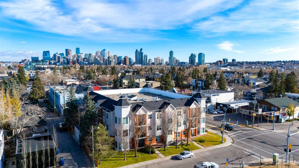 This sunny, bright 2nd floor, fully air conditioned 2 bedroom, 2 bath condo has been updated throughout! The white kitchen has plenty of cabinets, stainless steel appliances and an peninsula island with raised breakfast bar and overlooks the dining area and living room which has patio doors leading to your covered south facing balcony. The primary bedroom has a walk thru closet and 4 piece ensuite. The 2nd bedroom/den would be perfect for a home office or over night guests with the 3 piece bath close by. The insuite laundry room can accommodate full sized washer and dryer and provides insuite storage. You have a storage locker and a titled parking stall in the heated underground parkade which also has a car wash bay for the residents use. With such a great location close to the many amenities of Kensington, schools, transit, and an easy commute to downtown, SAIT, the U of C and the Foothills and the Children's hospitals, this home is not to be missed!