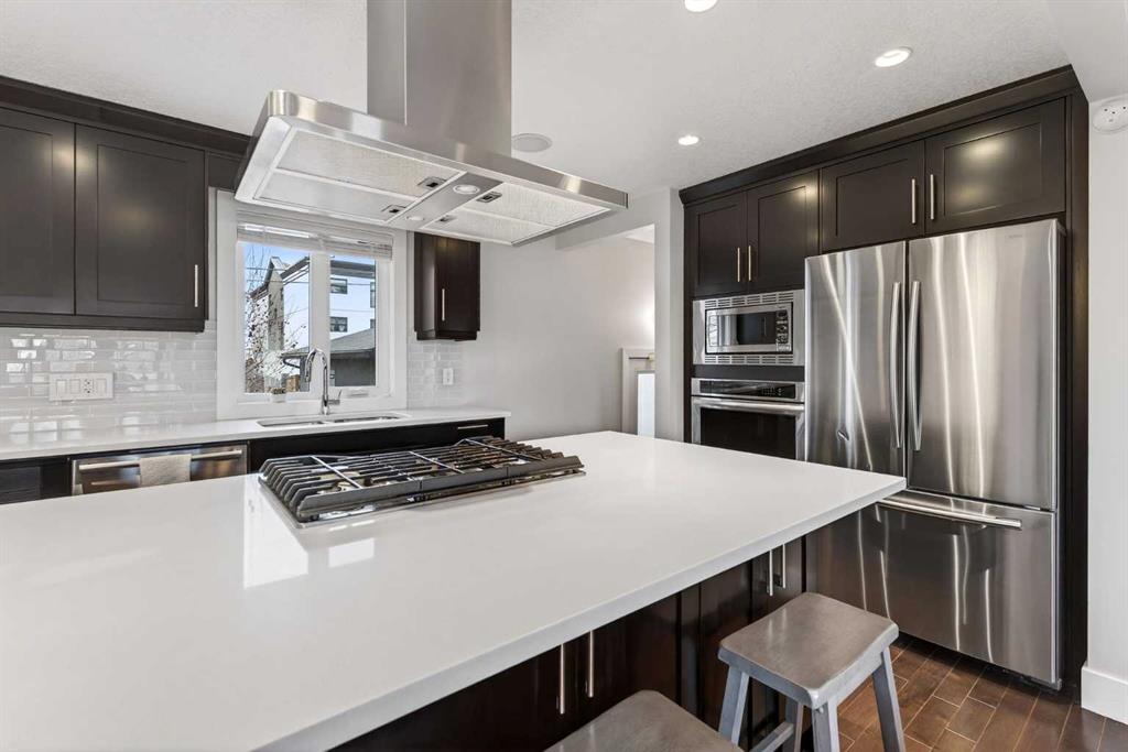 Discover a sophisticated lifestyle in this beautifully renovated Westgate bungalow situated on a private corner of a quiet street. This location offers a seamless balance of serenity and convenience with an effortless commute to downtown and quick access to the river walk pathways and the mountains. Facing a lush green space that provides both privacy and a natural area for recreation this home is perfectly suited for modern urban professionals or those looking for a versatile family environment. The open concept main floor features rich hardwood floors and a designer kitchen centered around a massive quartz island. With a premium gas range a beverage fridge and extensive counter space this home is a dream for those who love to host social gatherings and festive holiday dinners.
