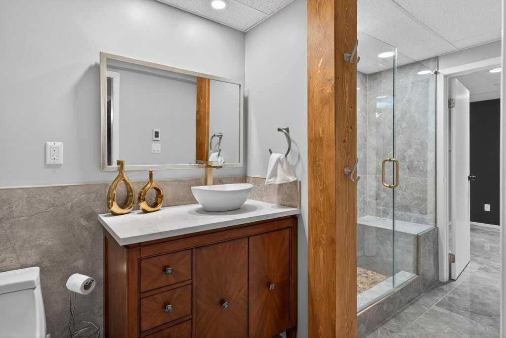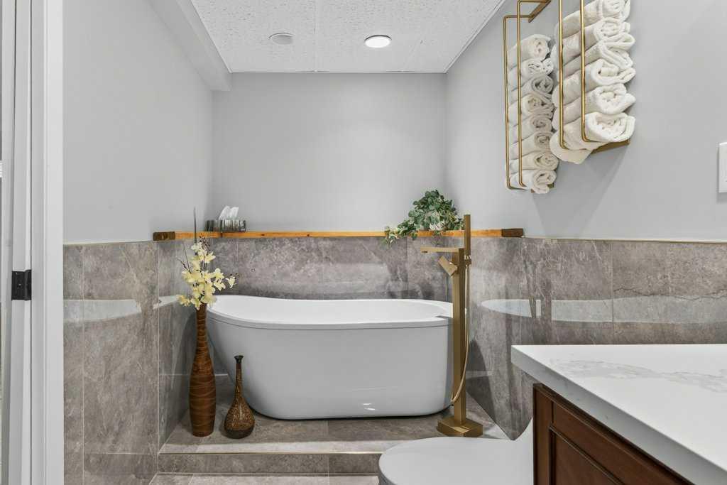 Step inside to a bright, open main floor featuring a fully renovated kitchen (2022) with white shaker cabinetry, stainless steel appliances (including a convection oven and fridge with water/ice), dimmable pot lights, and smooth painted ceilings. The main bathroom has been completely transformed with a custom vanity and a luxurious glass walk-in shower. The basement has a second primary bedroom ensuite with heated ceramic tiles in the bathroom and around the bedroom. It also includes an outdoor hot tub and an upgraded electric panel. The house is surrounded with a beautiful concrete pathway.
