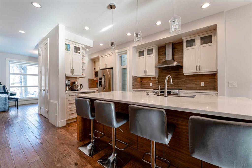 Thoughtfully crafted with eco conscious features throughout, the home includes in floor heating on all levels, spray foam insulation, and triple pane heat deflecting windows. Each floor has dual zone temperature controls. Spanning approximately 3,200 square feet of fully finished living space, the open concept layout is flooded with natural light thanks to numerous windows and a sunny south facing backyard. The main floor welcomes you with a stylish front entrance featuring a built in bench beside a flexible office or study space. Wide plank hardwood flooring carries through the main and upper levels, leading into a beautifully designed living area with a sleek gas fireplace and custom built ins. The chef inspired kitchen is the heart of the home, complete with stainless steel appliances, quartz countertops, a gas range, extensive cabinetry, and a massive island with seating that is perfect for entertaining. Upstairs, the primary retreat is a true sanctuary, offering a luxurious five piece ensuite with double sinks, a large soaker tub, and an oversized glass steam shower. A spacious second bedroom, a full bathroom, and a conveniently located laundry room complete the second level. The third storey features a generous bonus or family room, a third bedroom, and another full bathroom, making it an ideal space for guests, teens, or a private retreat. The builder finished basement adds even more versatility with a cozy media or TV area, built in shelving and workspace, a fourth bedroom, and a full bathroom. To finish off the basement, you have a built-in hidden wine cellar. Meticulously maintained with a recently replaced new furnace and circulator heads for the in-floor heating that should last another 10-15 years. Step outside to a backyard with a well designed garden bed surround an oversized deck accessed directly from the living room sliding doors. The fully fenced yard offers both beauty and privacy, while the double detached garage features dual sided doors, with an additional door to drive through and park a well sized RV, trailer or more. With four bedrooms, five bathrooms, exceptional craftsmanship, and high end finishes throughout, this home is a rare opportunity for those seeking modern luxury, comfort, and sustainability in one of Calgary’s most desirable inner city communities. Book your private showing today.