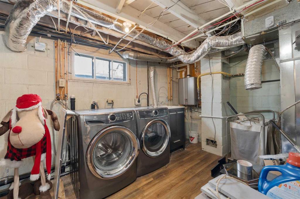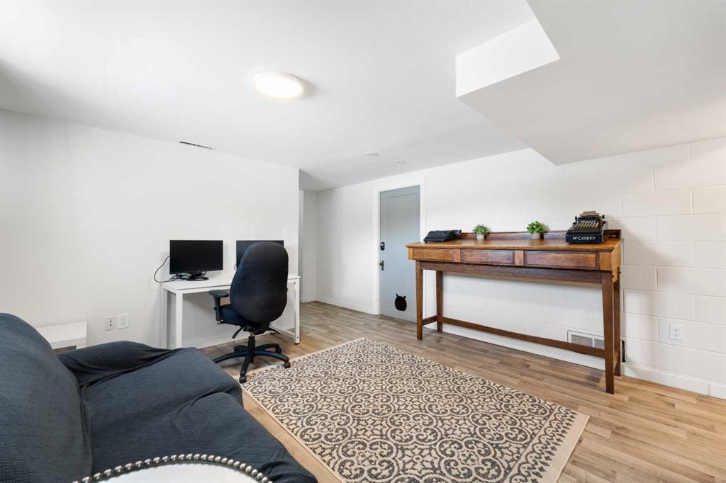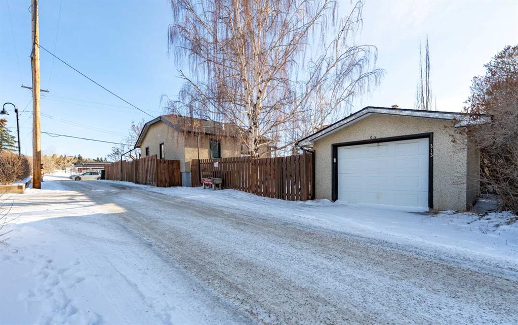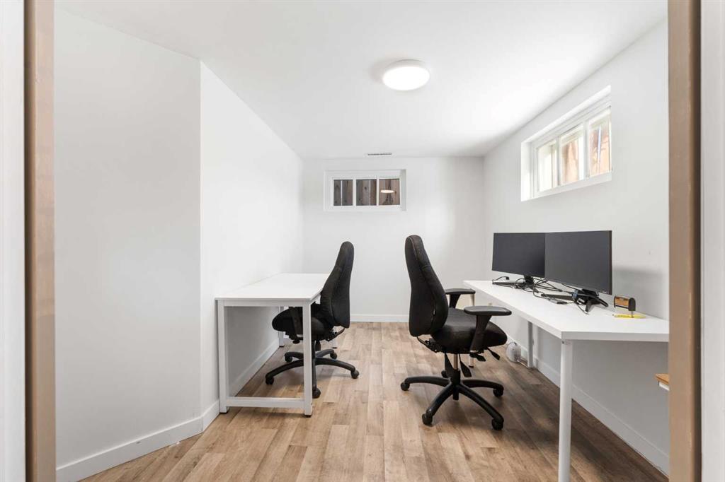 Located in Cochrane, this commercial bungalow in a residential style setting offers a flexible workspace suitable for a variety of business uses. Currently occupied by a professional services office, the property is laid out to accommodate both open work areas and private rooms. Added feature for this property included for a live/work setup. Zoned C-T (Commercial Transition) approved uses include professional and business offices, financial and health services, childcare and day home operations, artist studios, personal services, select retail uses, and home occupations (Class 1 & 2). The main level includes a functional kitchen and dining area with stainless steel appliances, a spacious office near the entry, two additional office or meeting rooms, and a 4-piece bathroom. The fully finished lower level provides a large open workspace, two enclosed rooms, a 3-piece bathroom, and a dedicated laundry area with sink and storage. A fenced backyard with patio and mature landscaping offers outdoor space for staff, while the front porch and maintained yard create a professional first impression. The property offers central air conditioning for year-round comfort and a single detached garage for added convenience. This unique mixed-use property combines residential comfort with the functionality of a commercial space.