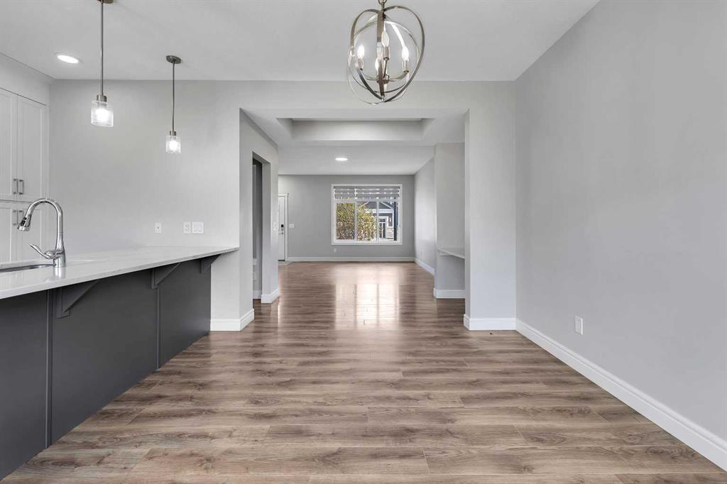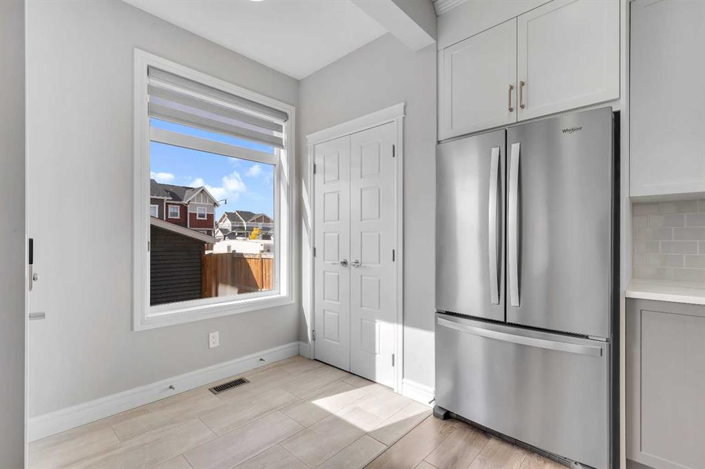 At the heart of the home is the stylish kitchen, featuring quartz countertops, tall white upper cabinets paired with modern grey lowers, and a large flat island that blends beautifully into the overall design. The kitchen opens to a spacious dining room and a cozy breakfast nook—perfect for everyday family meals or entertaining guests. It’s the ideal gathering space, whether for quick weekday breakfasts or relaxed dinners with loved ones.