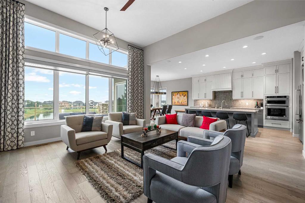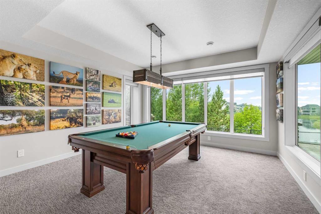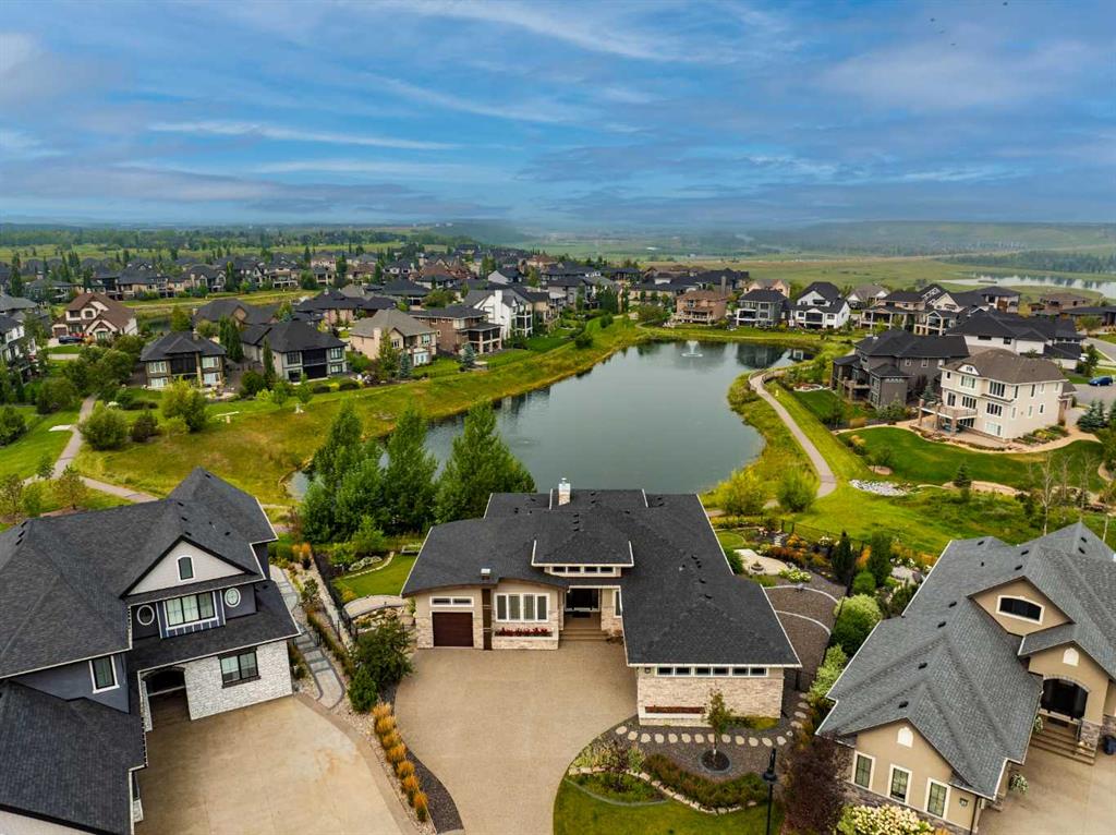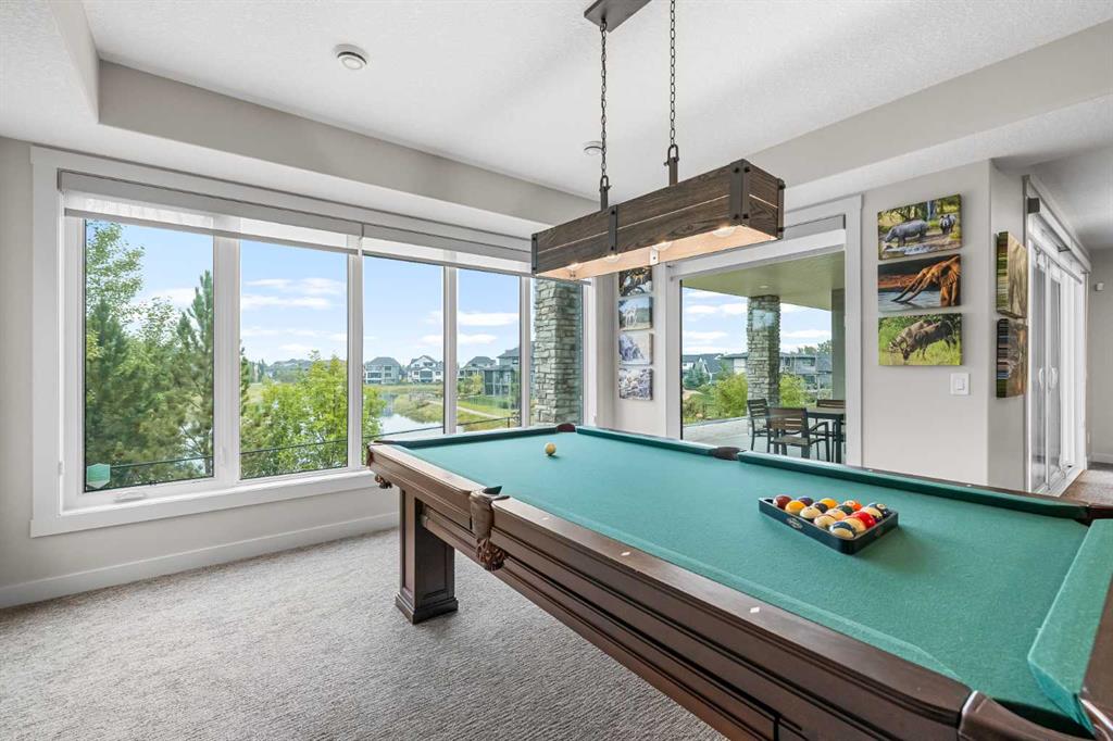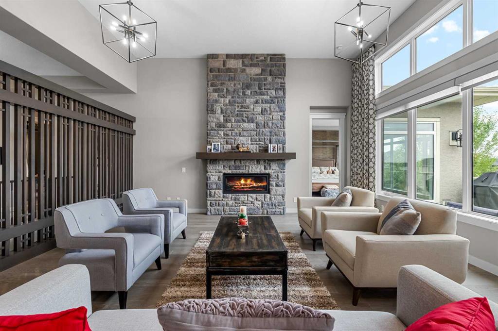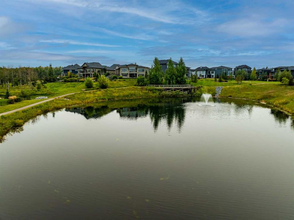 Set within a serene landscape of water and winding pathways, this luxury walkout bungalow offers architectural sophistication and natural tranquility. Designed on the sought-after Carrara 2 floor plan, the home captures a sense of openness and grandeur from the moment you arrive, with its expansive triple car garage and striking exterior. Inside, soaring 10-foot and 13-foot ceilings create an immediate feeling of volume and light, elevating every space with an airy, refined atmosphere. The main living area showcases comfort and grandeur with oversized windows framing uninterrupted views of the pond and pathway system beyond. Natural light floods the interior throughout the day, reflecting off carefully selected finishes and enhancing the home’s warm, modern palette. The heart of the home is an expansive and beautifully appointed kitchen. A massive island, custom cabinetry, upgraded appliances, storage galore with a functional yet elegant butlers pantry, a separate walk in pantry and short and convenient close entrance through the oversized mudroom to the garage entrance perfect for bringing in grocery's. The open concept connects the dining and great room, forming an ideal setting for both everyday living and upscale entertaining. Clean architectural lines, generous proportions, and an effortless flow between spaces define the layout, with elevated ceiling heights adding drama and distinction without sacrificing intimacy. The dining area flows onto the expansive upper terrace, where a glass-railing system ensures your view of the pond remains uninterrupted while you enjoy an evening cocktail. Or seat your guests in this well appointed living room with a floor to ceiling stone fireplace both great options. Work from home in the private office away from the hustle and bustle of family activities. The primary suite is a sanctuary of its own, generous in size and enhanced by the home’s signature high ceilings, offering a quiet escape with serene views and a spa-inspired ensuite and a massive closet that won’t disappoint. The walkout lower level extends the living space in a way that feels fully integrated with the outdoors. Large glass doors open directly onto a private patio, where the gentle presence of the pond and landscaped pathways creates a peaceful retreat just steps from your living room. This level is perfectly suited for hosting guests, relaxing with family, or creating a personalized entertainment space, all while maintaining the same high-end feel as the main floor. Private bedrooms, a wet bar, a large family room, games area, yoga/ exercise room and finished storage room complete the level. Throughout the home, the combination of architectural height, thoughtful layout, and premium craftsmanship results in a residence that feels both expansive and welcoming. The triple car garage adds ample space for vehicles, storage, and lifestyle needs. This home embodies a rare balance of luxury, comfort, and natural beauty.