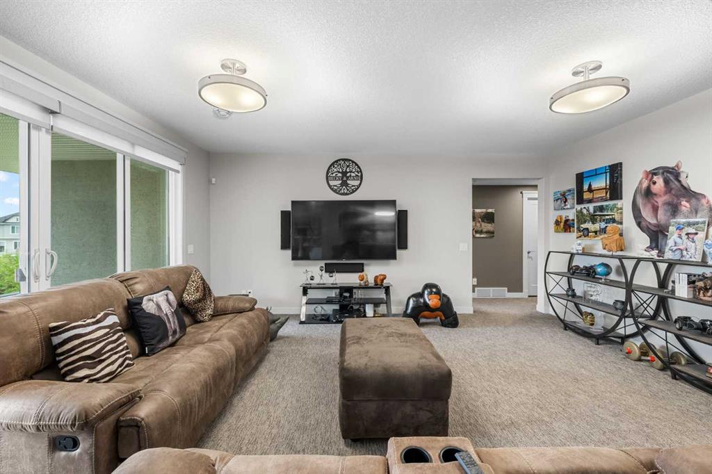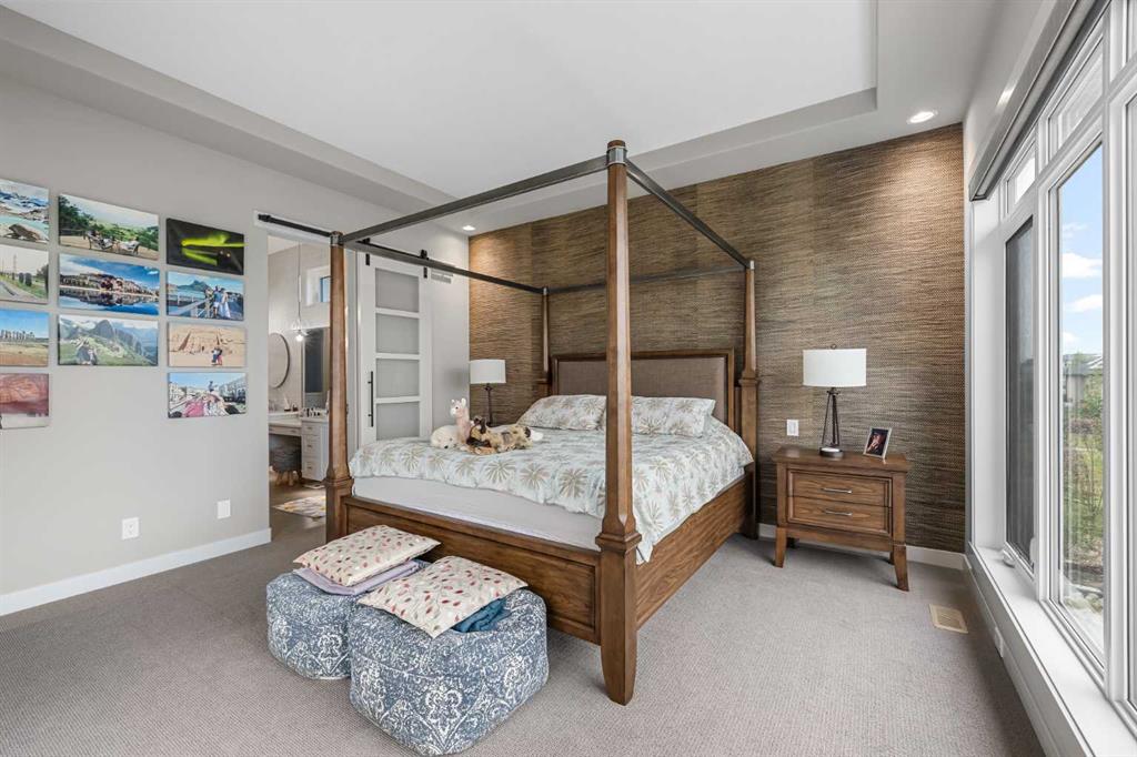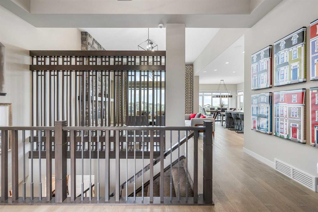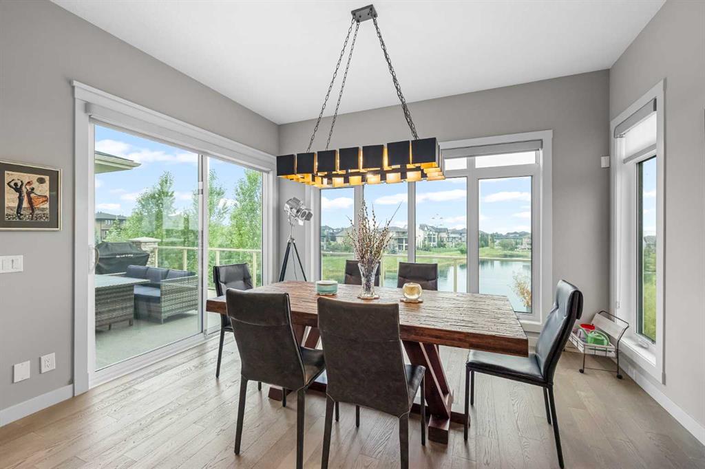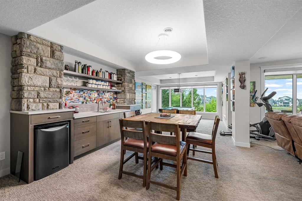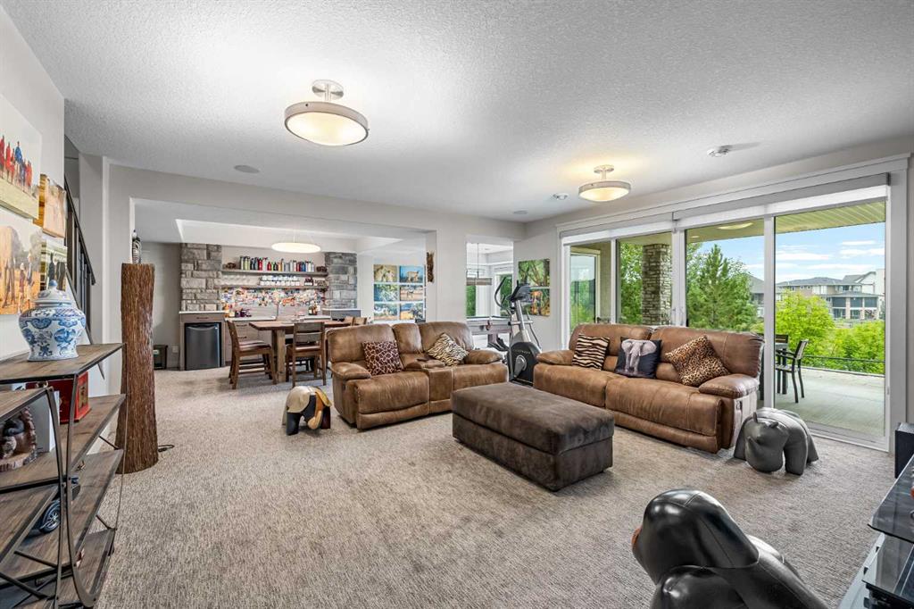 Set within a serene landscape of water and winding pathways, this luxury walkout bungalow offers architectural sophistication and natural tranquility. Designed on the sought-after Carrara 2 floor plan, the home captures a sense of openness and grandeur from the moment you arrive, with its expansive triple car garage and striking exterior. Inside, soaring 10-foot and 13-foot ceilings create an immediate feeling of volume and light, elevating every space with an airy, refined atmosphere. The main living area showcases comfort and grandeur with oversized windows framing uninterrupted views of the pond and pathway system beyond. Natural light floods the interior throughout the day, reflecting off carefully selected finishes and enhancing the home’s warm, modern palette. The heart of the home is an expansive and beautifully appointed kitchen. A massive island, custom cabinetry, upgraded appliances, storage galore with a functional yet elegant butlers pantry, a separate walk in pantry and short and convenient close entrance through the oversized mudroom to the garage entrance perfect for bringing in grocery's. The open concept connects the dining and great room, forming an ideal setting for both everyday living and upscale entertaining. Clean architectural lines, generous proportions, and an effortless flow between spaces define the layout, with elevated ceiling heights adding drama and distinction without sacrificing intimacy. The dining area flows onto the expansive upper terrace, where a glass-railing system ensures your view of the pond remains uninterrupted while you enjoy an evening cocktail. Or seat your guests in this well appointed living room with a floor to ceiling stone fireplace both great options. Work from home in the private office away from the hustle and bustle of family activities. The primary suite is a sanctuary of its own, generous in size and enhanced by the home’s signature high ceilings, offering a quiet escape with serene views and a spa-inspired ensuite and a massive closet that won’t disappoint. The walkout lower level extends the living space in a way that feels fully integrated with the outdoors. Large glass doors open directly onto a private patio, where the gentle presence of the pond and landscaped pathways creates a peaceful retreat just steps from your living room. This level is perfectly suited for hosting guests, relaxing with family, or creating a personalized entertainment space, all while maintaining the same high-end feel as the main floor. Private bedrooms, a wet bar, a large family room, games area, yoga/ exercise room and finished storage room complete the level. Throughout the home, the combination of architectural height, thoughtful layout, and premium craftsmanship results in a residence that feels both expansive and welcoming. The triple car garage adds ample space for vehicles, storage, and lifestyle needs. This home embodies a rare balance of luxury, comfort, and natural beauty.